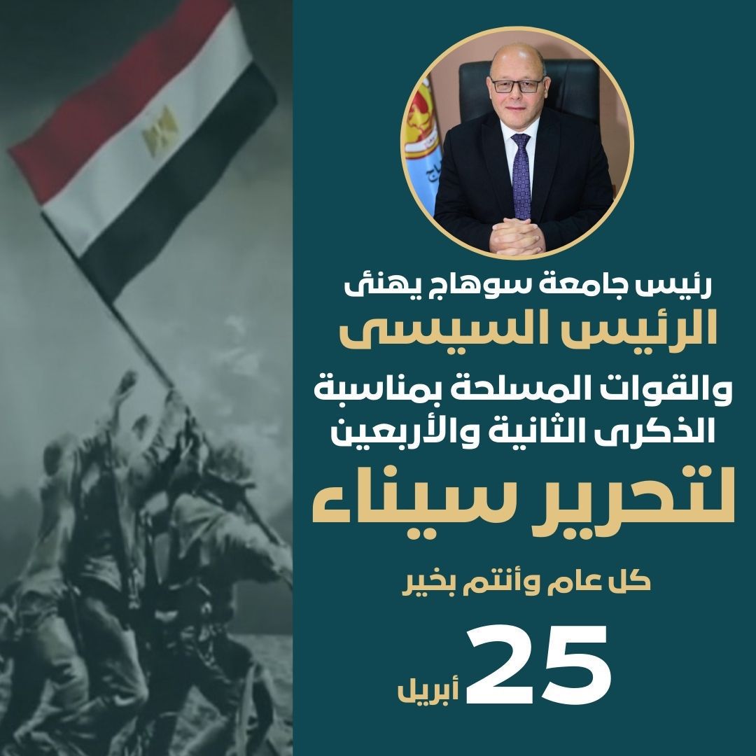 قدم الدكتور حسان النعماني رئيس جامعة سوهاج، التهنئة للرئيس عبدالفتاح السيسي رئيس جمهورية مصر العربية والقائد الأعلى للقوات المسلحة بمناسبة ذكرى تحرير سيناء ال42.