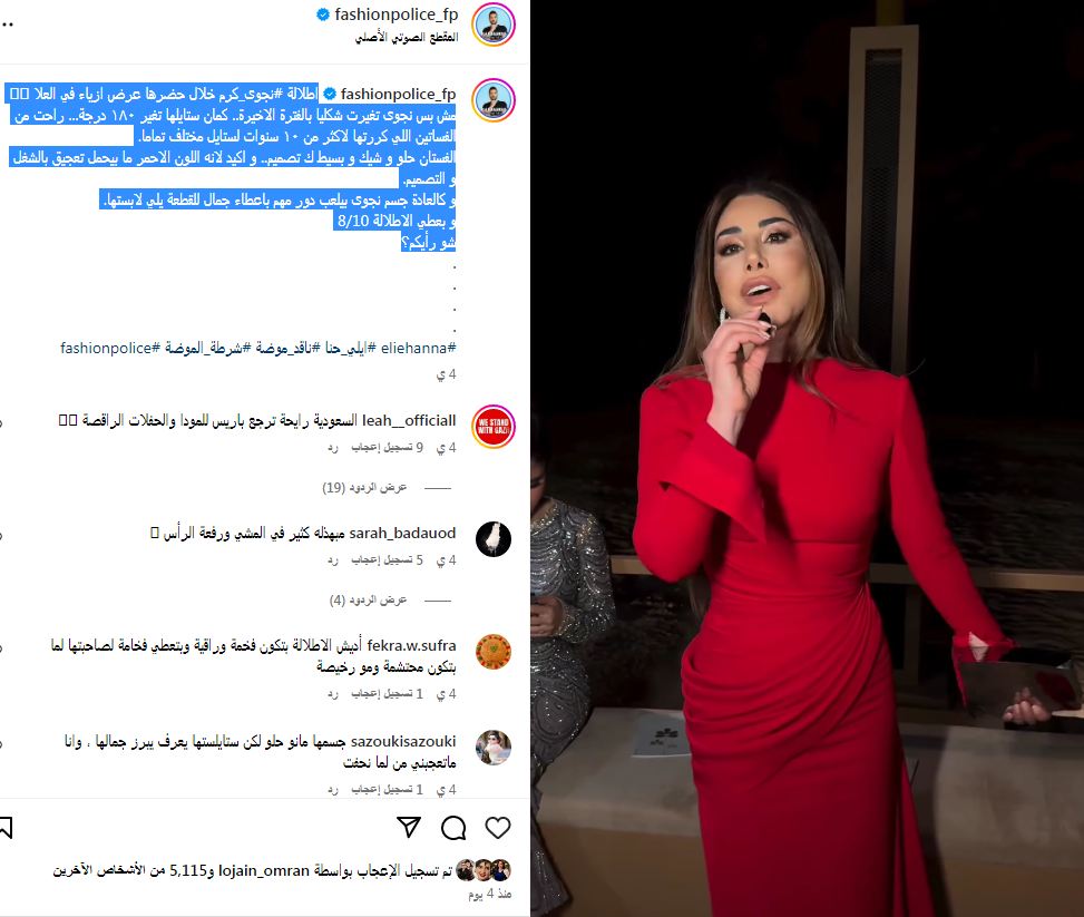 وجاء تعليق إيلي حنا للإطلالة نجوى كرم عبر الصفحة الرسمية لشرطة الموضة بالإنستجرام، مؤيده لها: قائلًا: "اطلالة نجوى كرم خلال حضرها عرض ازياء في العلا، مش بس نجوى تغيرت شكليا بالفترة الاخيرة.. كمان ستايلها تغير 180 درجة".
