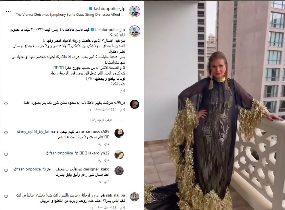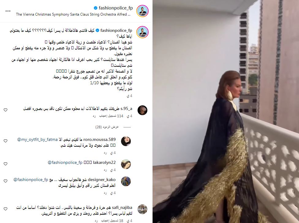 وكان تعليق إيلي حنا معارض لإطلالتها، قائلًا: "كيف فاتتني هالاطلالة لـ يسرا كيف؟ كيف ما بعتتولي اياها كيف؟، شو هيدا الفستان؟ الاعياد خلصت و زينة الاعياد خلص وقتها".