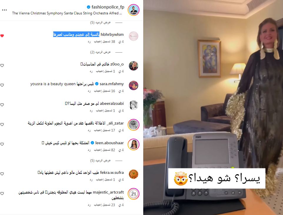 بينما كان لمتابعي شرطة الموضة رأي آخر مختلف عن رأي ناقد الموضة إيلي حنا، وجاءت التعليقات مؤيده لذوق ولفستان يسرا، رصدنا أبرزها: " طريقتك بتقييم الإطلالات ابد محلوه ممكن تكون ناقد بس بصوره أفضل، هي حرة و فرحانة و سعيدة باللبس . انت شنوا دخلك؟ اساسا من انت لتقيم لباس يسرا؟ احشم على روحك و يزي من التقطيع و الترييش، بالنسبة إلي عجبني ومناسب لعمرها".
