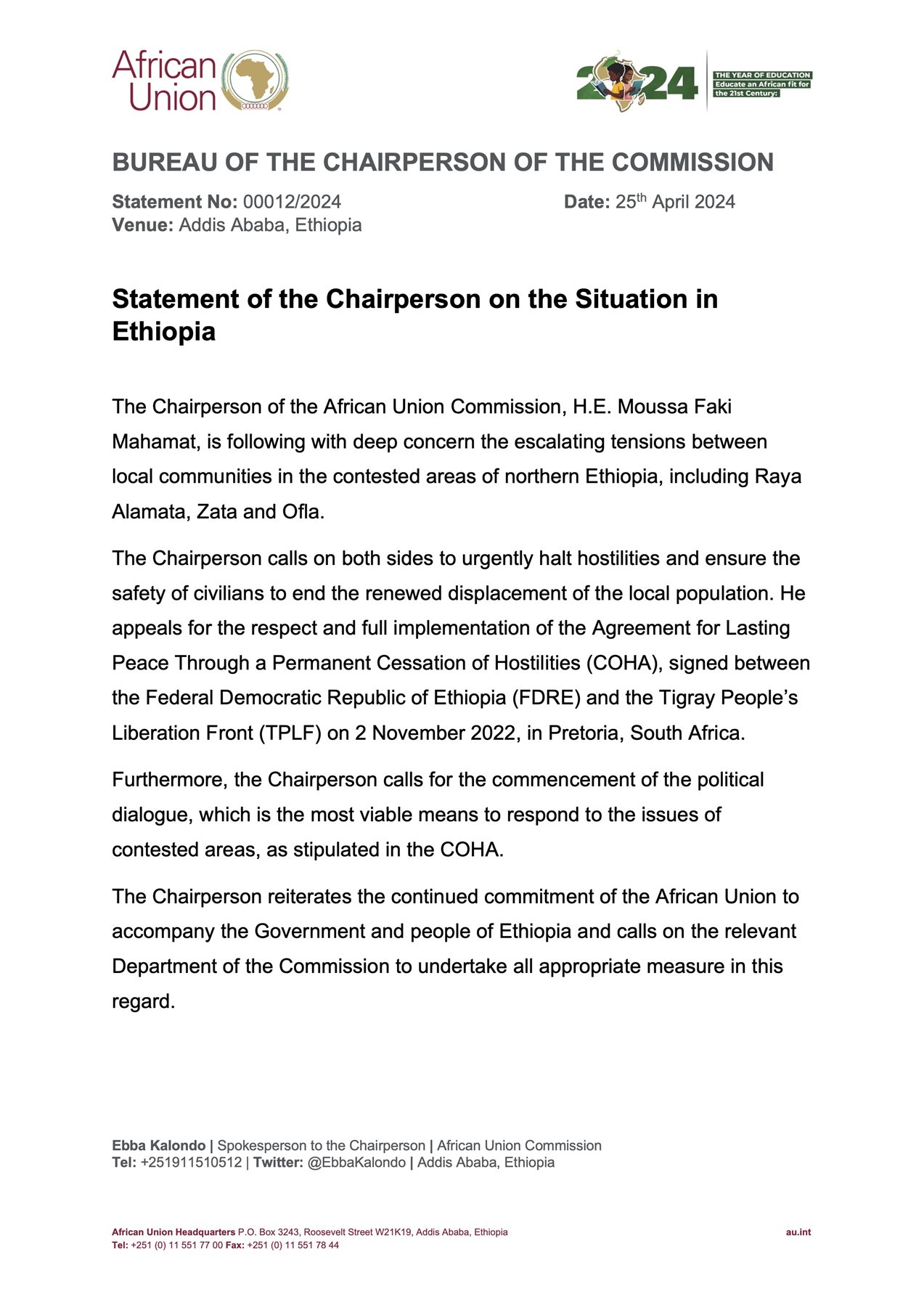 طبقًا لـ بيان، ودعا رئيس مفوضية الاتحاد الأفريقي موسى فقي محمد، يوم الجمعة، "الجانبين إلى وقف الأعمال العدائية بشكل عاجل وضمان سلامة المدنيين لإنهاء النزوح المتجدد للسكان المحليين".