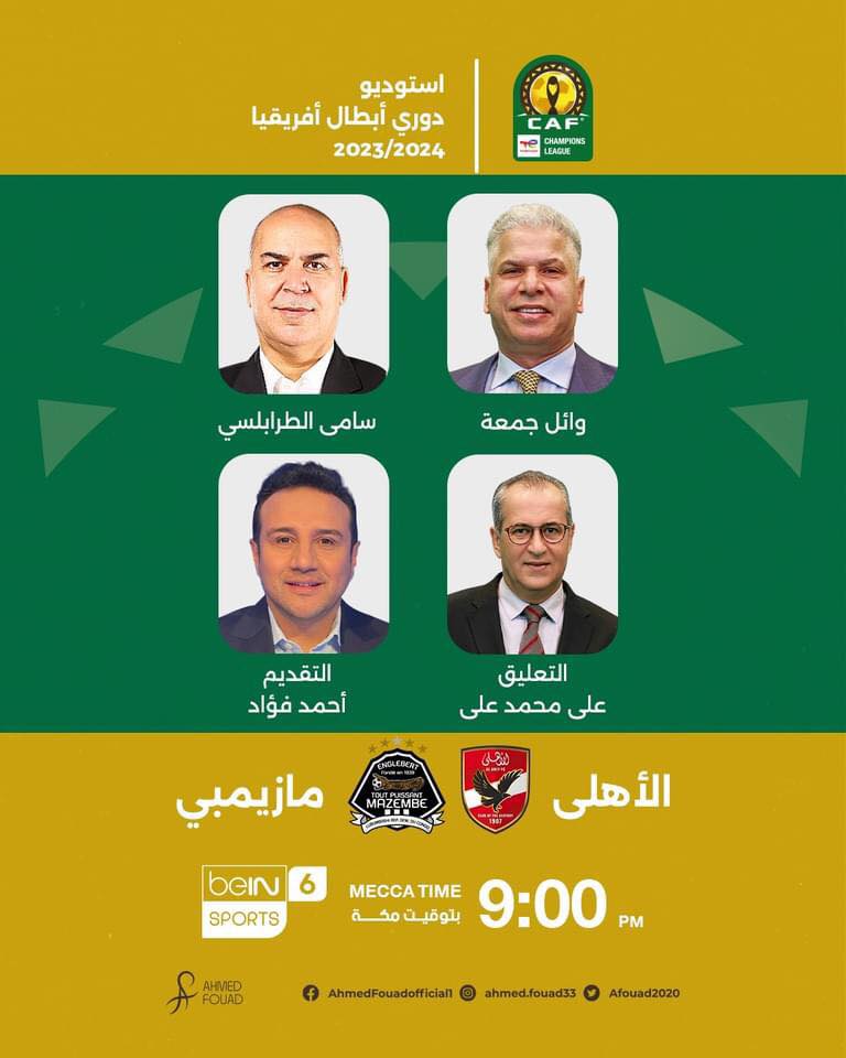 يمكنكم مشاهدة مباراة اليوم ضمن منافسات اياب دور نصف نهائي دوري ابطال افريقيا بين الاهلي المصري ومازيمبي عبر شبكة قنوات بي ان سبورت القطرية الناقل الحصري لمواجهات دوري ابطال افريقيا في الشرق الاوسط ودول شمال افريقيا ، حيث تبذاع المباراة عبر شاشة بي ان سبورت 6 بصوت المعلق العربي علي محمد علي ، وعبر شاشة تيم سبةرت بث ارضي بصوت امير محروس .