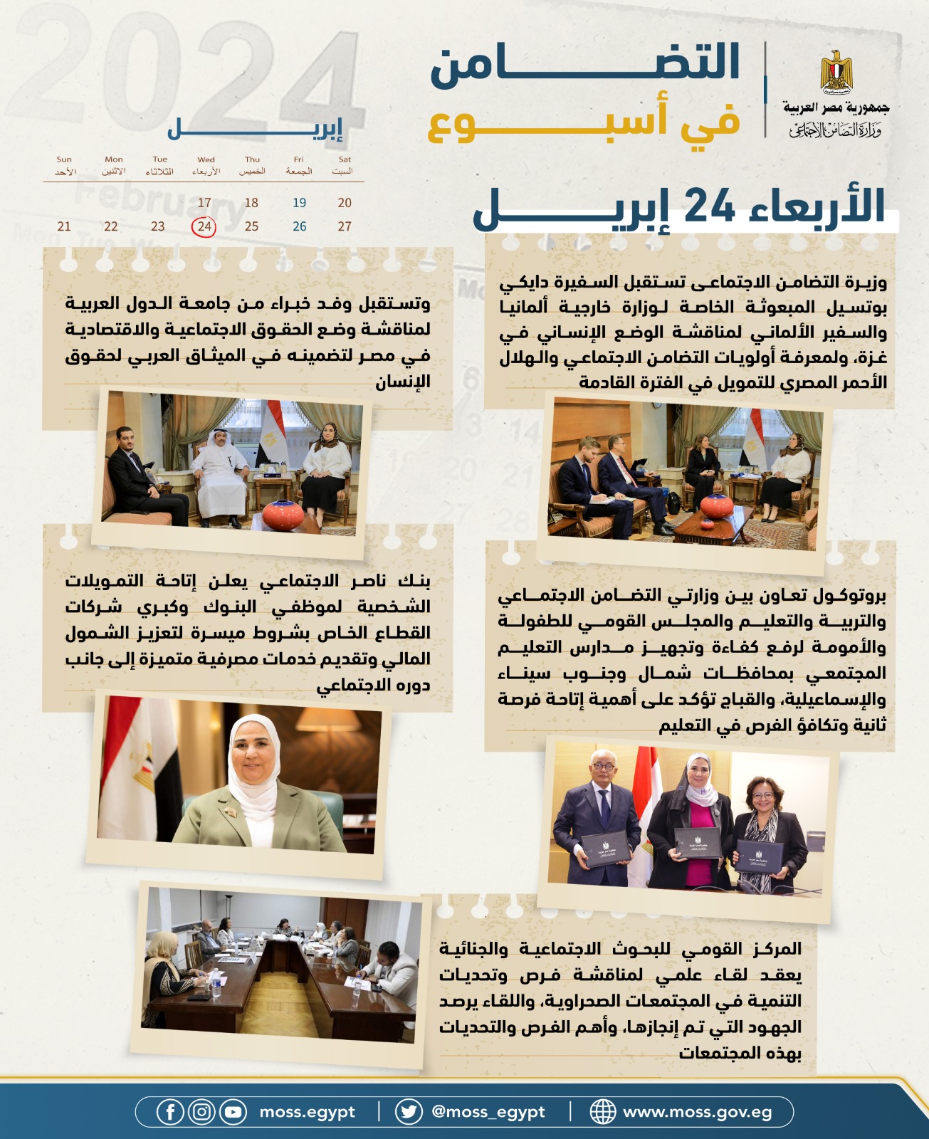 - وزيرة التضامن الاجتماعى تستقبل السفيرة دايكي بوتسيل المبعوثة الخاصة لوزارة خارجية المانيا والسفير الألماني لمناقشة الوضع الإنساني في غزة، ولمعرفة أولويات التضامن الاجتماعي والهلال الأحمر المصري للتمويل في الفترة القادمة.