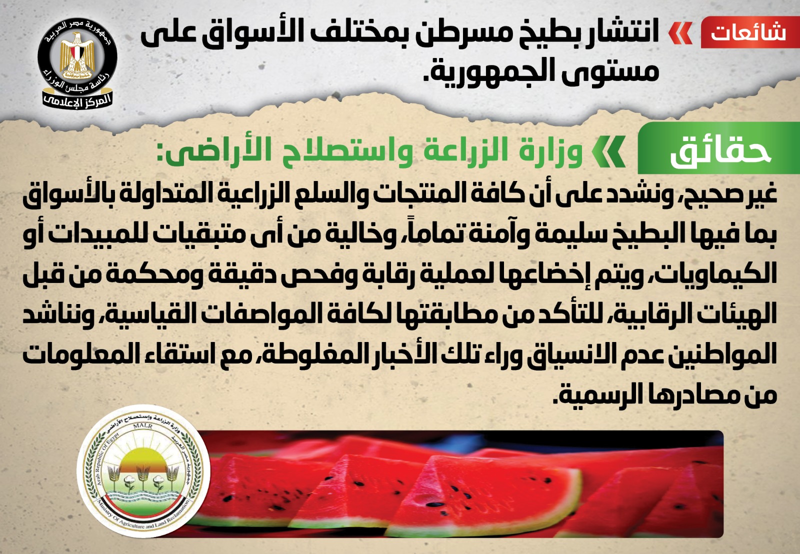 وشدد على أن المنتجات والسلع الزراعية كافة المتداولة بالأسواق بما فيها البطيخ سليمة وآمنة تمامًا، وخالية من أي متبقيات للمبيدات أو الكيماويات، ويتم إخضاعها لعملية رقابة وفحص دقيقة ومحكمة من الهيئات الرقابية، للتأكد من مطابقتها للمواصفات القياسية كافة، وناشدا المواطنين عدم الانسياق وراء تلك الأخبار المغلوطة، مع استقاء المعلومات من مصادرها الرسمية.