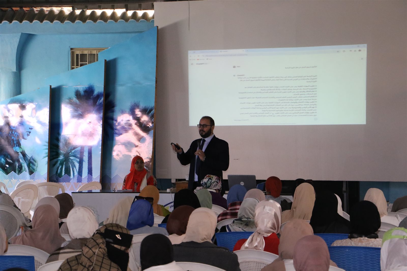 واختتم حديثه بتعريف المشاركات ببعض التطبيقات التي تعمل بتقنية الذكاء الاصطناعي في مجالات الكتابة وتسويق المنتجات على المنصات الإلكترونية المختلفة، بجانب تقديم