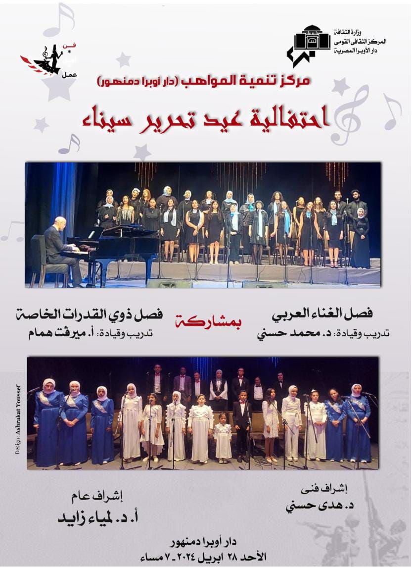 تواصل دار الأوبرا المصرية برئاسة الدكتورة لمياء زايد، احتفالاتها بعيد تحرير سيناء، تقيم حفلا للدارسين بمركز تنمية المواهب باوبرا دمنهور تحت اشراف الدكتورة هدى حسني فى السابعة مساء غد الأحد علي مسرح أوبرا دمنهور، ضمن الفعاليات المميزة لوزارة الثقافة.