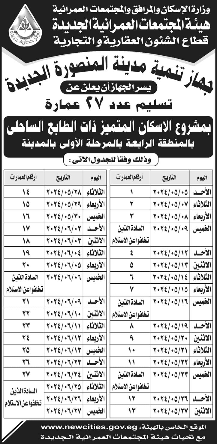 - سيقوم جهاز مدينة المنصورة الجديدة بتسليم وحدات العمارات أرقام 1 و2 و3 في مشروع الإسكان المتميز ذى الطابع الساحلي بالمنطقة الرابعة خلال أيام 5 و7 و8 مايو المقبل على الترتيب.