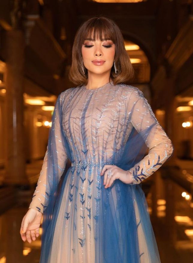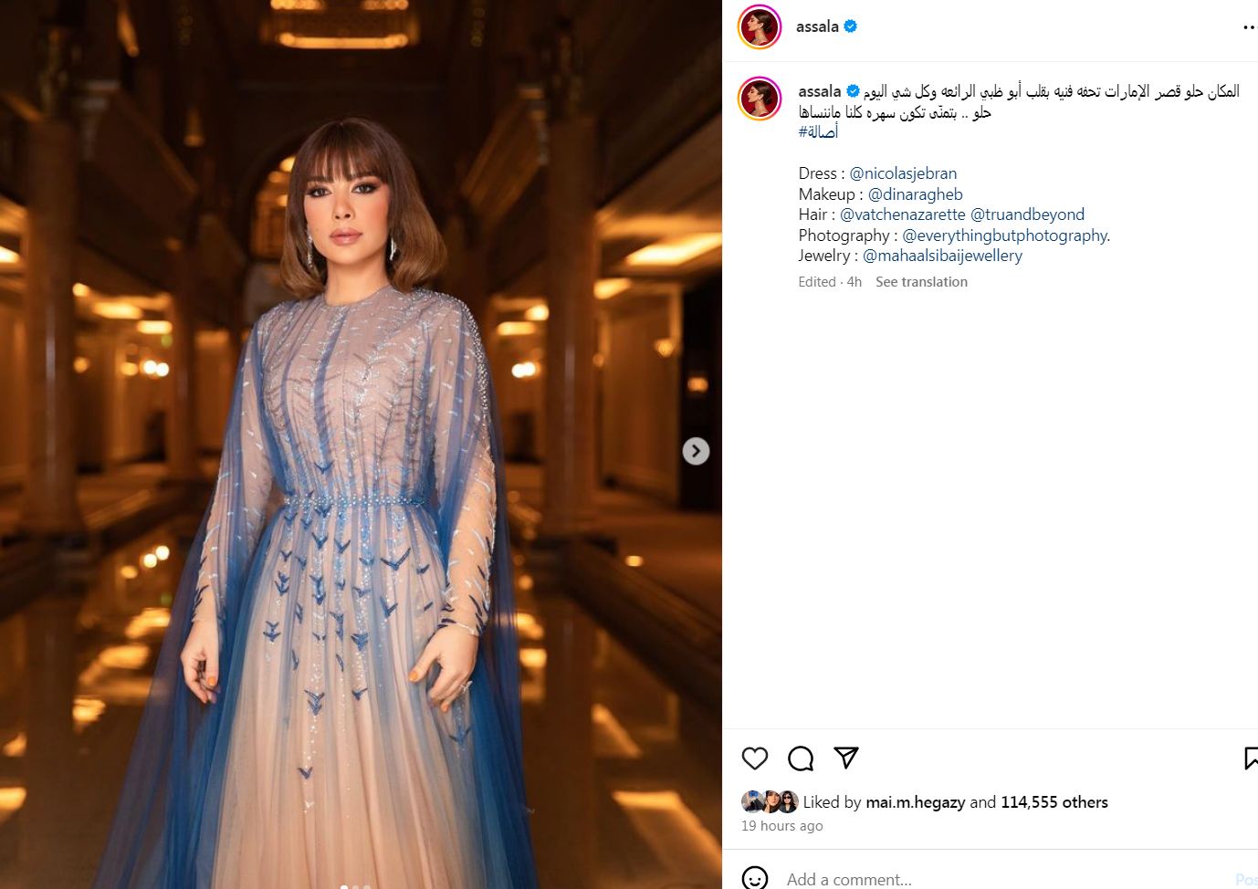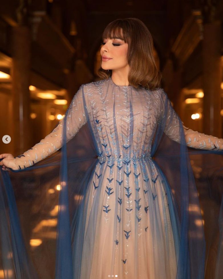 وتألقت أصالة بإطلالة ساحرة، مزجت بين الأناقة والجاذبية في آن واحد، حيث ارتدت فستان طويل مجسم من اعلى وفضفاض من أسفل، بأكمام طويلة، صمم من قماش التل باللون الأزرق وتحته البيج الفاتح، زين ببعض حبات الخرز الراقية، الفستان حمل توقيع مصمم الأزياء نيكول جبران الذي إبدع في تصميمه.