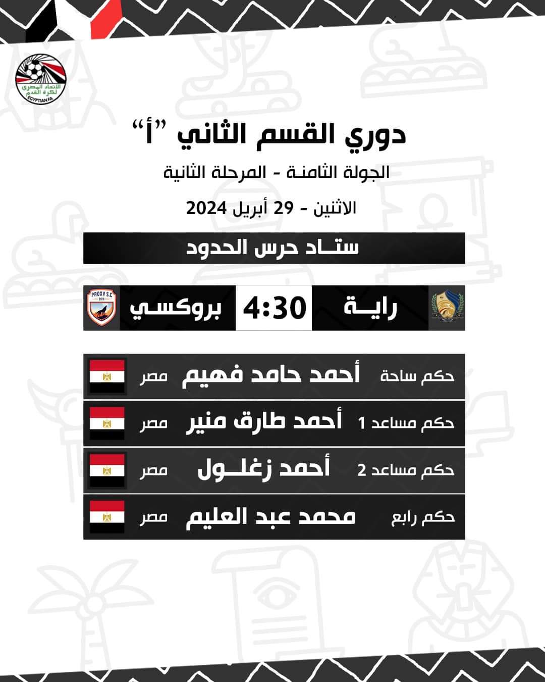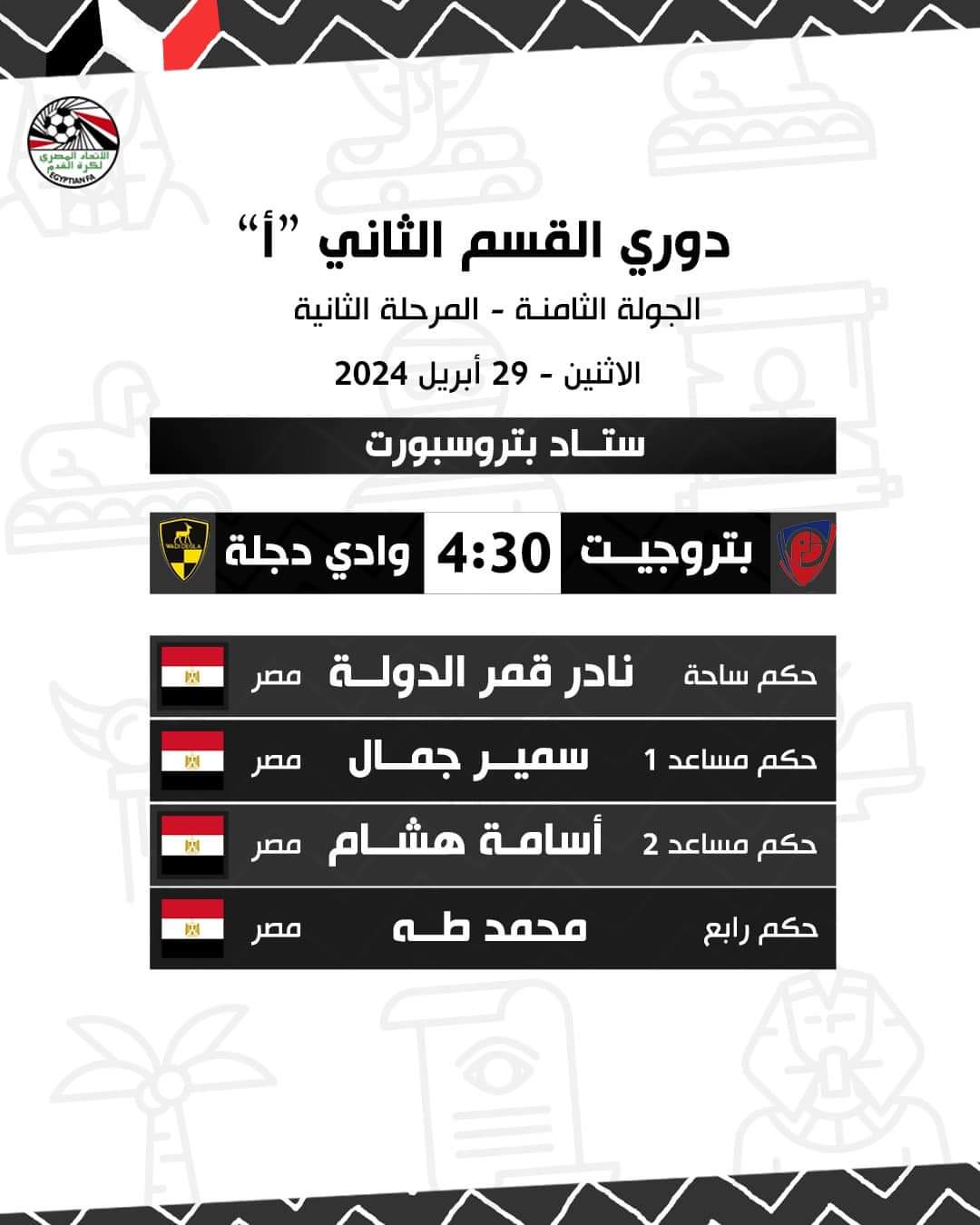 أعلنت لجنة الحكام التابعة للاتحاد المصرى لكرة القدم طاقم حكام 5 مباريات من المرحلة الثانية من دورى المحترفين، والمقرر إقامتها في الساعة الثالثة والنصف عصر اليوم الإثنين، ضمن لقاءات الجولة الثامنة للمرحلة الثانية لدوري المحترفين للمجموعة المنافسة على الصعود للدوري الممتاز .