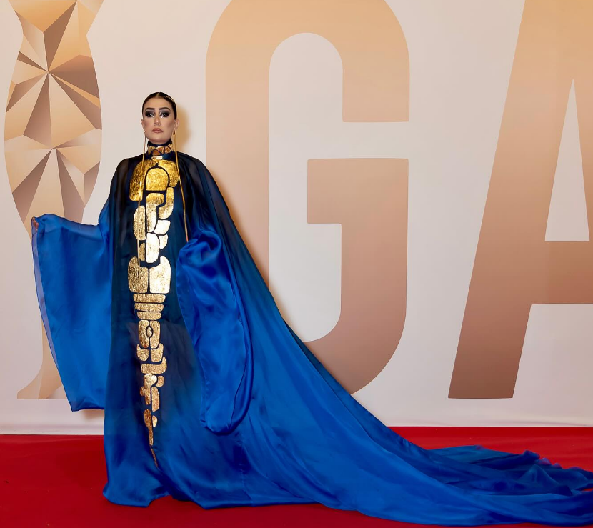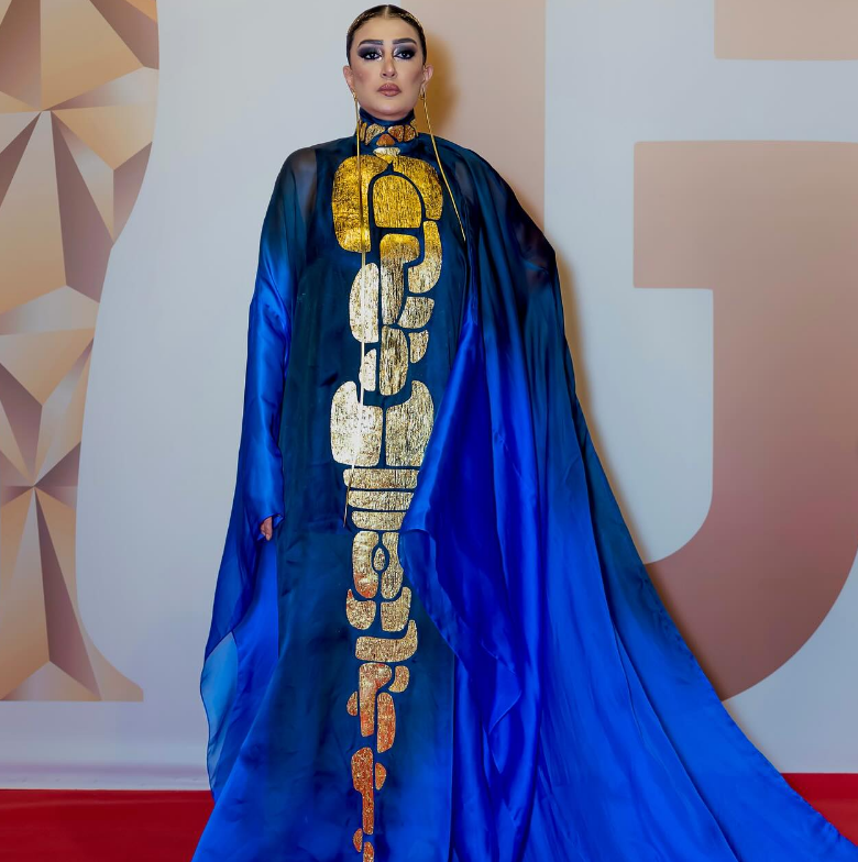 ولفتت غادة عبدالرازق الأنظار بفستانها المختلف والمستوحى من التصميم الفرعوني، فتميز بقماش الشيفون ولونه الكحلي المدرج للأزرق، وأكمام فضفاضة مع ذيل طويل، ومطرز من الصدر بطباعة باللون الذهبي، مع رقبة عاليه، مما عكست أناقتها واختلافها، واكتفت بأقراط ذهبية طويلة جدًا، لتتدلى على الصدر، ويضيف لمسه مختلفة وساحرة للوك.