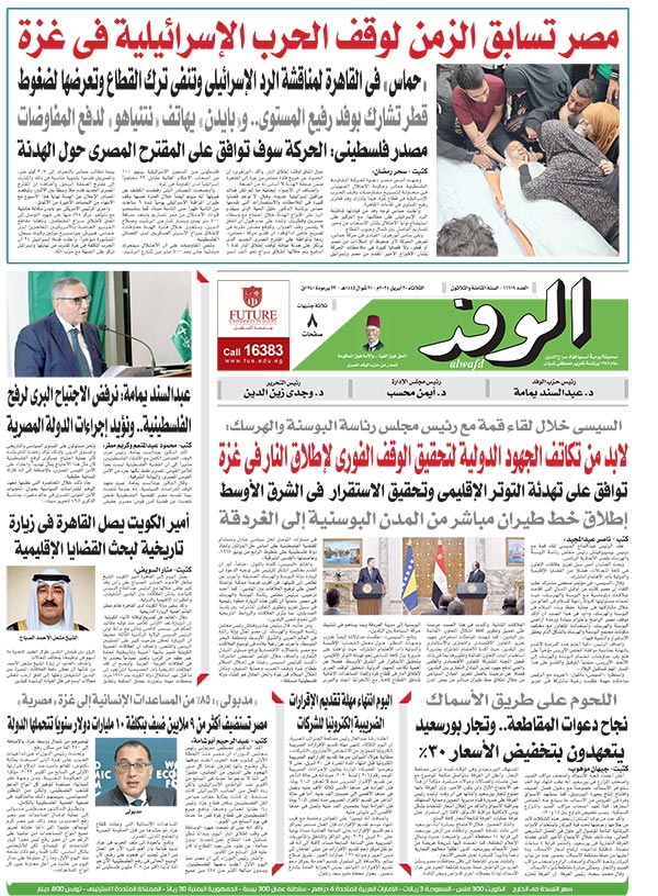 تنشر جريدة الوفد في عددها الصادر، غدًا الثلاثاء، الكثير من الموضوعات والتقارير الإخبارية المهمة، أبرزها: "مصر تسابق الزمن لوقف الحرب الإسرائيلية في غزة".
