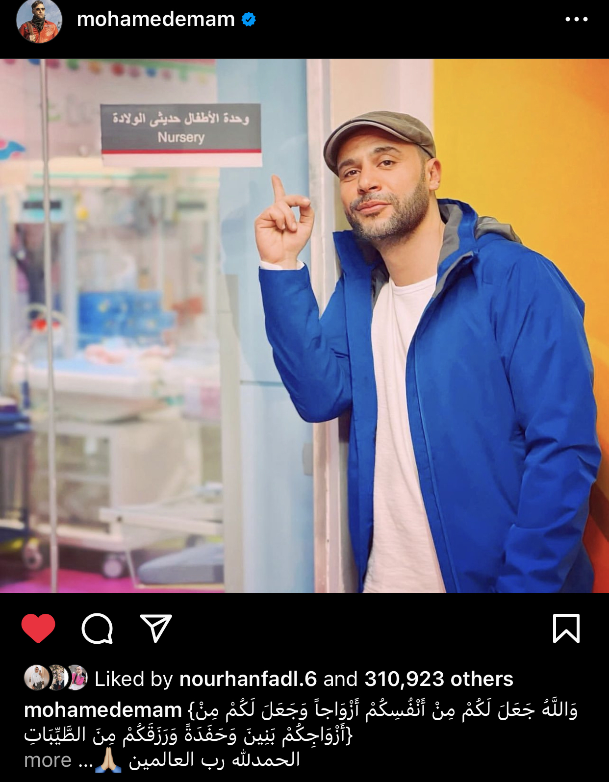 ونشر محمد إمام صورة له فى المستشفى ، بجانب وحدة الأطفال الحديثي الولادة، عبر حسابه الرسمي على موقع تبادل الصور “إنستجرام”، وعلق قائلاً:"وَاللَّهُ جَعَلَ لَكُم مِّنْ أَنفُسِكُمْ أَزْوَاجًا وَجَعَلَ لَكُم مِّنْ أَزْوَاجِكُم بَنِينَ وَحَفَدَةً وَرَزَقَكُم مِّنَ الطَّيِّبَاتِ".