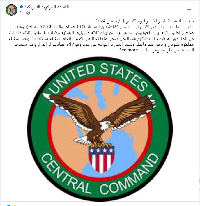 وقال القيادة عبر حسابها الرسمي بالعربي بموقع التواصل الاجتماعي "فيسبوك" :"بين الساعة 10:00 صباحا والساعة 5:20 مساءً يوم 29 أبريل (بتوقيت صنعاء) اطلق الارهابيون الحوثيون ثلاثة صورايخ باليستية مضادة للسفن وثلاثة طائرات من المناطق الخاضعة لسيطرتهم في اليمن ضمن منطقة البحر الاحمر باتجاه (سفينة سيكلاديز)، وهي سفينة مملكوه لليونان و ترفع علم مالطا.