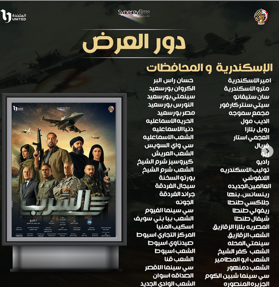 وفي الصورة الآتية الخريطة الكاملة لعرض فيلم السرب في مختلف دور العرض السينمائي في مصر: