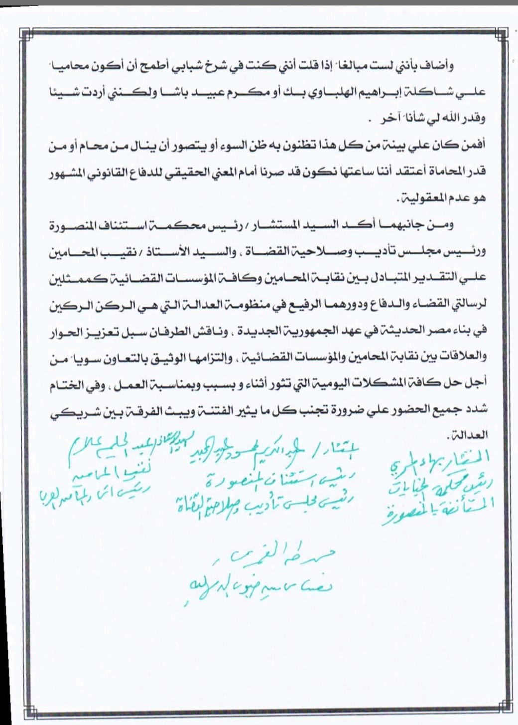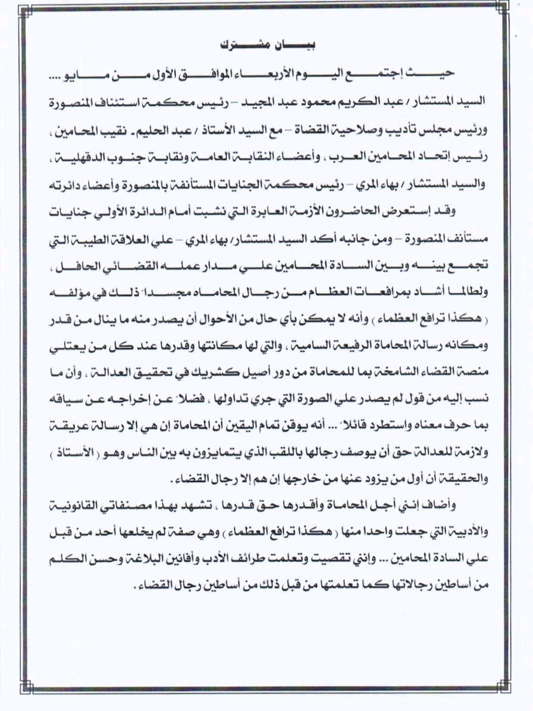 السيد المستشار / عبد الكريم محمود عبد المجيد - رئيس محكمة استئناف المنصورة ورئيس مجلس تأديب وصلاحية القضاة - مع السيد الأستاذ / عبد الحليم - نقيب المحامين رئيس إتحاد المحامين العرب، وأعضاء النقابة العامة ونقابة جنوب الدقهلية والسيد المستشار / بهاء المري - رئيس محكمة الجنايات المستأنفة بالمنصورة وأعضاء دائرته وقد استعرض الحاضرون الأزمة العابرة التي نشبت أمام الدائرة الأولي جنايات مستأنف المنصورة - ومن جانبه أكد السيد المستشار بهاء المري - علي العلاقة الطيبة التي تجمع بينه وبين السادة المحامين علي مدار عمله القضائي الحافل ولطالما أشاد بمرافعات العظام من رجال المحاماه مجسدا ذلك في مؤلفه ) هكذا ترافع العظماء ) وأنه لا يمكن بأي حال من الأحوال أن يصدر منه ما ينال من قدر ومكانه رسالة المحاماة الرفيعة السامية، والتي لها مكانتها وقدرها عند كل من يعتلي منصة القضاء الشامخة بما للمحاماة من دور أصيل كشريك في تحقيق العدالة، وأن ما نسب إليه من قول لم يصدر علي الصورة التي جري تداولها ، فضلا عن إخراجه عن سياقه بما حرف معناه واستطرد قائلا ... أنه يوقن تمام اليقين أن المحاماة إن هي إلا رسالة عريقة ولازمة للعدالة حق أن يوصف رجالها باللقب الذي يتمايزون به بين الناس وهو ( الأستاذ ) والحقيقة أن أول من يزود عنها من خارجها إن هم إلا رجال القضاء .