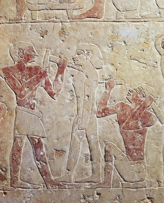 كما يتضح ذلك فى نقش فناني التماثيل وفيه يظهر أحدهم يعمل واقفًا من الأمام والآخر جالسًا من الخلف وكلاهما يعمل بشكل مريح يتيح له التركيز دون حدوث إصابة وقد أمسك كلاهما بالعصا الغليظة التي تمثل الشاكوش والأزميل اللازم للحفر ومن كل هذا يتضح وجود قواعد تنظيمة للعمال و كل له دوره والذى تم تطبيقه فى كل المنشئات بمصر القديمة مع الحرص على راحة العمال وحمايتهم من أى أخطار>