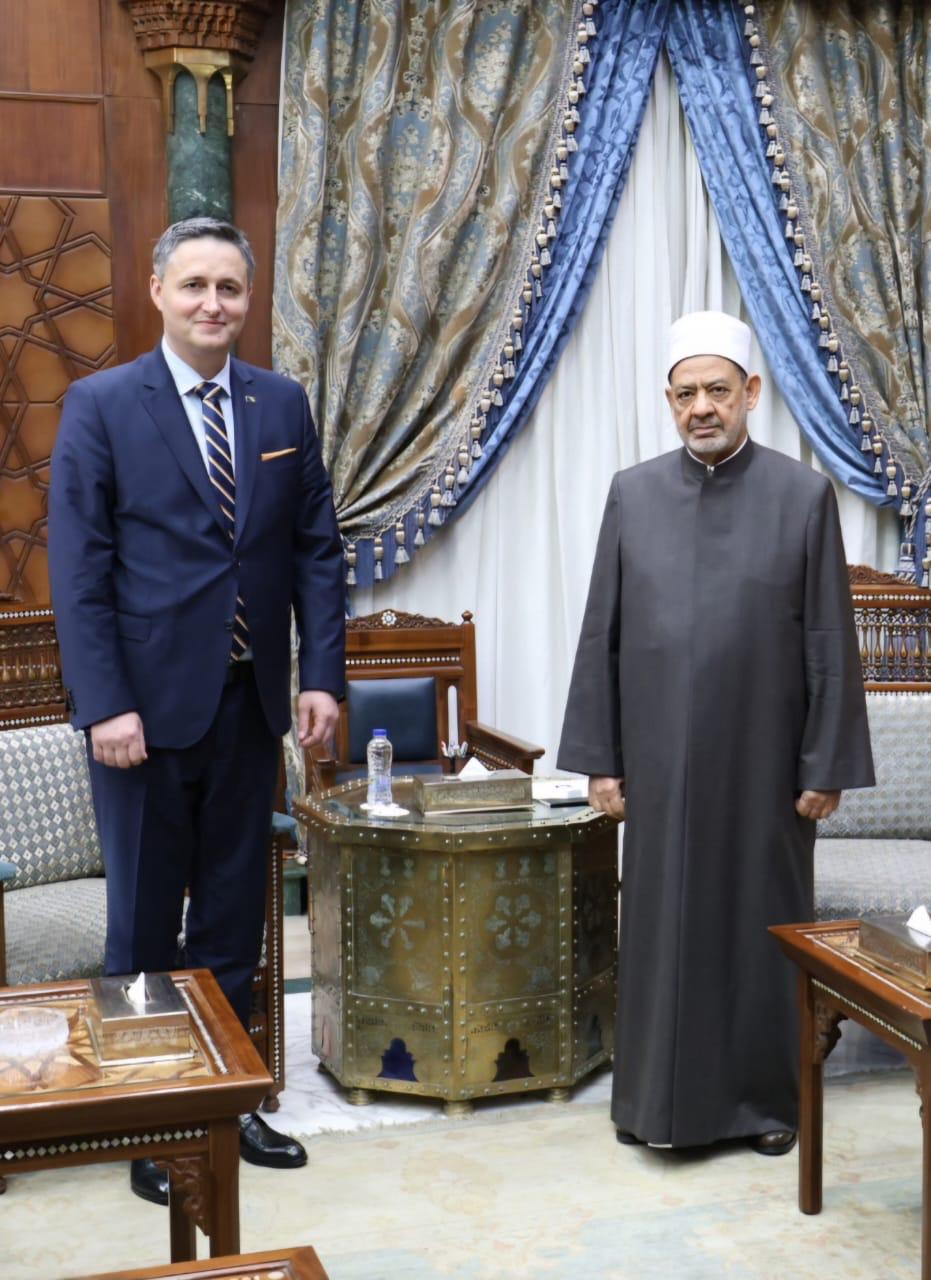 من جانبه، أعرب الرئيس البوسني عن سعادته بالتواجد في الأزهر الشريف، ولقائه فضيلة الإمام الأكبر، مصرحًا: "نفخر بالعلاقة التاريخية التي تربط بلادنا بالأزهر الشريف، هذا الصرح الإسلامي الكبير، ومنذ بدايات القرن الثامن عشر وحتى يومنا هذا؛ تخرَّج أكثر من ٣٠٠ عالم جليل من علمائنا في جامعة الأزهر؛ ليصبحو علماء أجلاء في بلادنا، وشاركوا في صناعة نهضة بلادنا، ولهم أثر عميق في تاريخ أمَّتنا، وخريجو الأزهر يحظون بتقدير كبير ومكانة عالية لدينا، ويتواجدون في مختلف المناصب القيادية والعلمية والأكاديمية في البلاد".