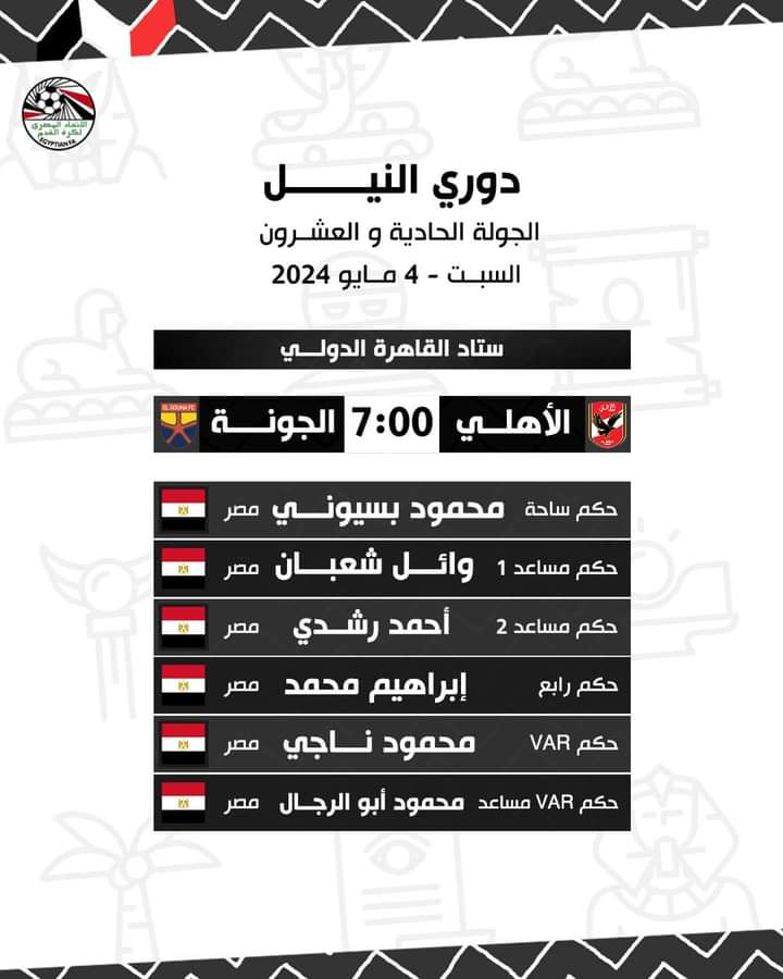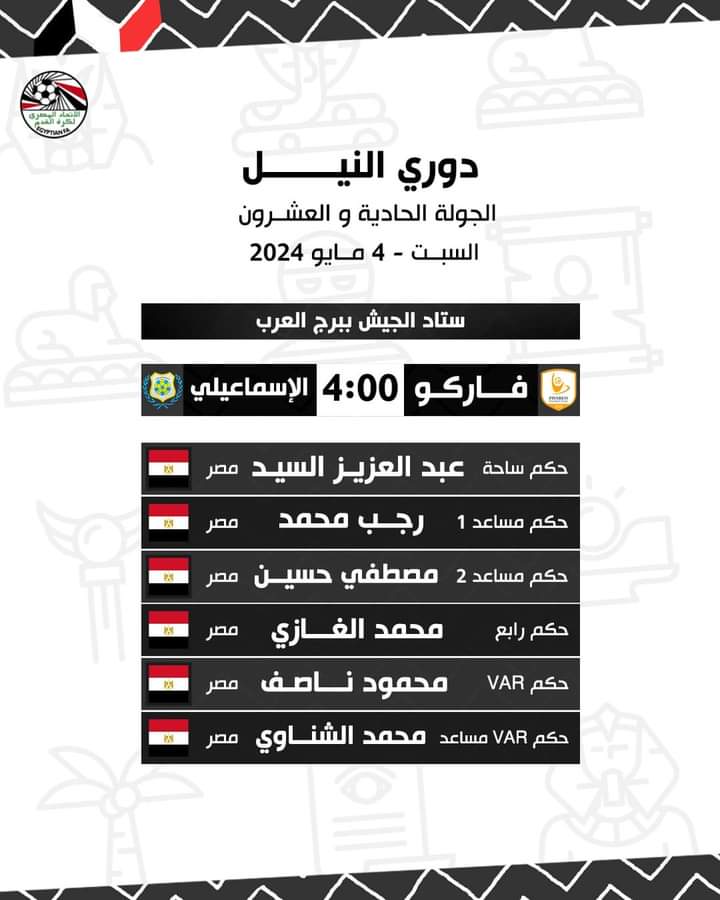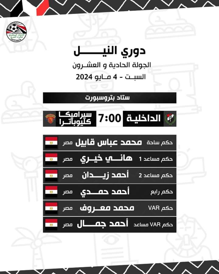 حكام مباريات اليوم السبت في الجولة الحادية والعشرين من دوري النيل