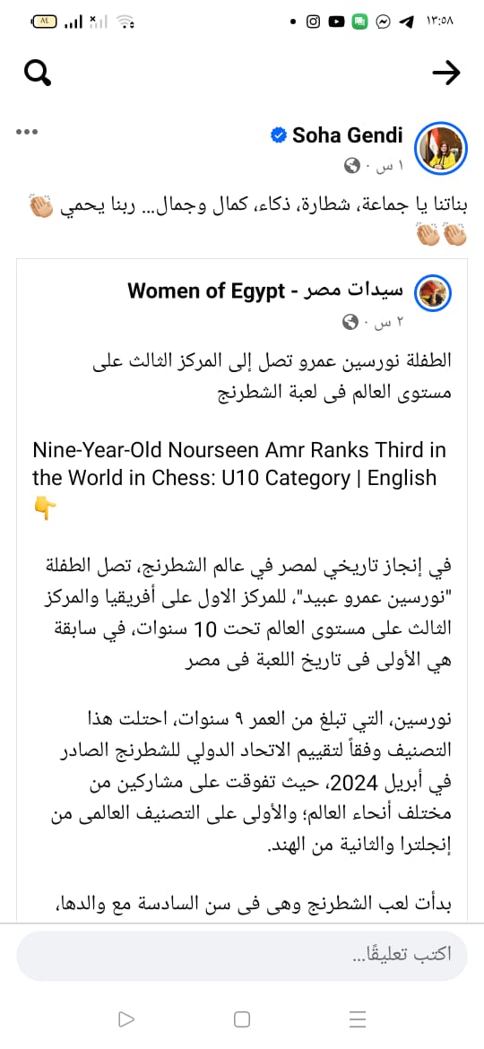 وصلت الطفلة "نورسين عمرو عبيد"، للمركز الاول على أفريقيا والمركز الثالث على مستوى العالم تحت 10 سنوات، في سابقة هي الأولى فى تاريخ اللعبة فى مصر، وفي إنجاز تاريخي لمصر في عالم الشطرنج.