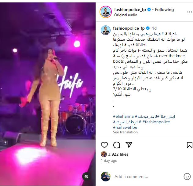 وجاء تعليق إيلي حنا على إطلالة هيفاء وهبي عبر الصفحة الرسمية لشرطة الموضة بالإنستجرام، معارض، حيث قال: " إطلالة هيفاء وهبي بحفلها بالبحرين، لو ما قرأت انه الاطلالة جديدة كنت مفكرها اطلالة قديمة لهيفاء".
