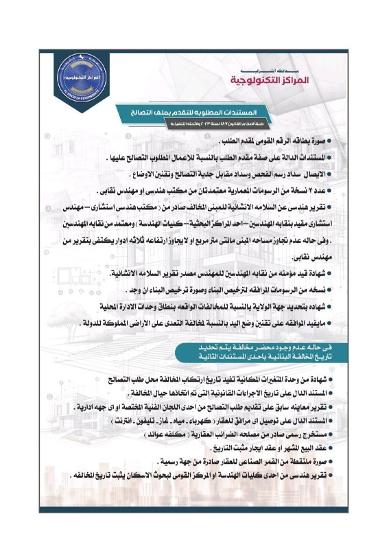 واشار سكرتير عام المحافظة أنه طبقاً لللائحة التنفيذية لقانون التصالح الجديد رقم 187 لسنة 2023 فالمراكز التكنولوجية منوطة بالتعامل وفحص واستخراج وتقديم الخدمات التالية:
