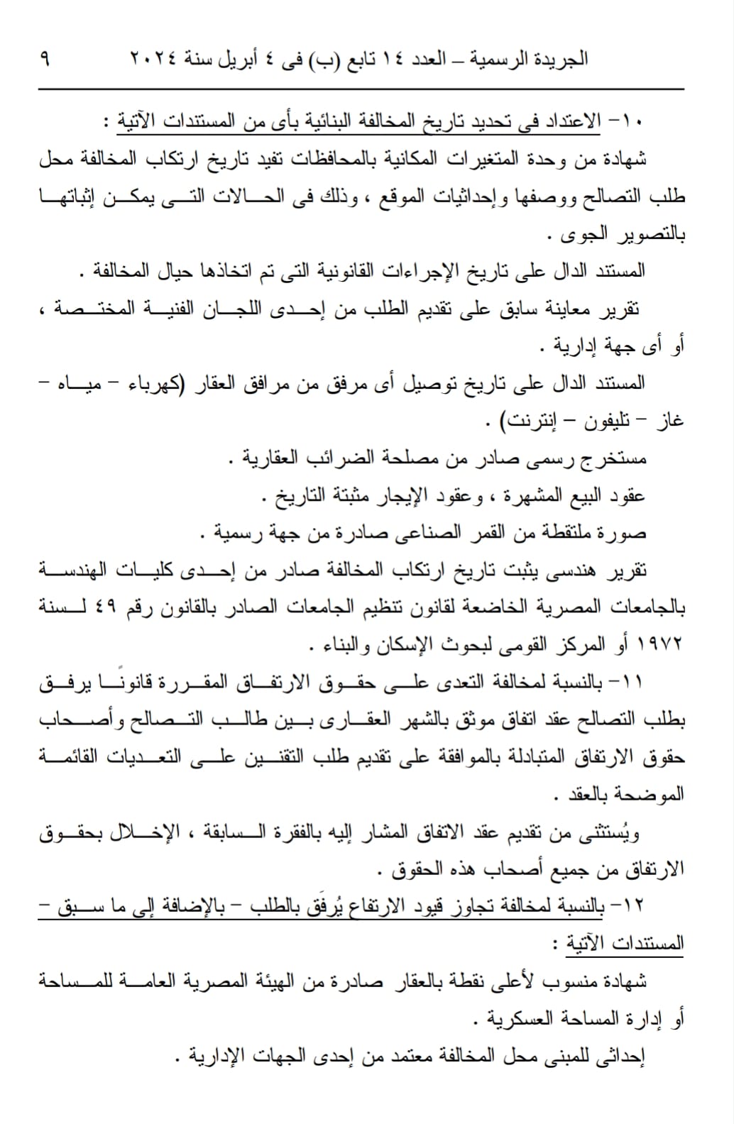 وشدد محافظ القاهرة على الأحياء بضرورة الإعلان عن المستندات والشروط التي نصت عليها اللائحة التنفيذية لقانون التصالح الجديد والتي يجب توافرها للتصالح وتقنين الأوضاع في مخالفات البناء تيسيراً على المواطنين مشيرًا إلى أن قانون التصالح الجديد أتاح للمواطنين حق التصالح على الإنشاءات، حتى التصوير الجوي بتاريخ 15/10/2023 لإعطاء فرص لأكبر عدد من المواطنين لتقديم طلبات التصالح .