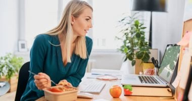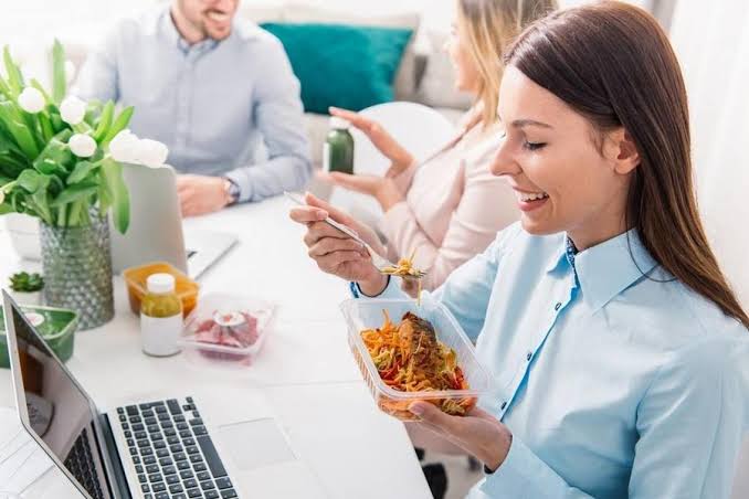 ينصح بعدم تناول الطعام أثناء العمل أو الاجتماعات. بدلاً من ذلك، يجب أن تخصص وقتًا لتناول الطعام بعيدًا عن مكتب العمل. كما يجب عليك الاستماع لإشارات الجوع في جسمك وتجنب الأطعمة غير الصحية، واختيار الخيارات الغذائية الصحية مثل الفواكه، والمكسرات، والزبادي.