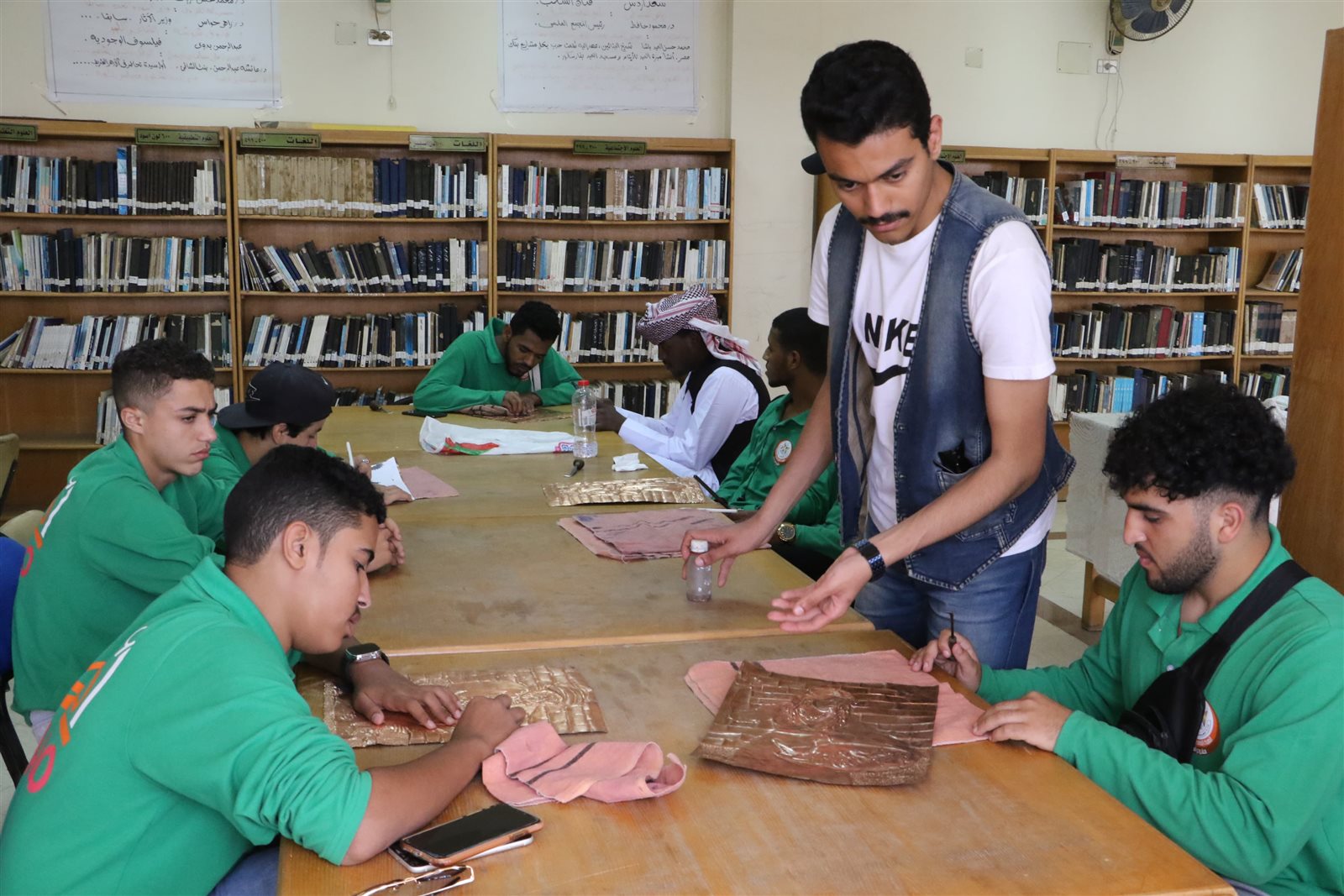 أعقب ذلك تدريب عملي تعرف خلاله الشباب على طريق إخفاء عيوب القطعة تمهيدا لوضع مادة البلاستيك، ولصق اللوحة المرسومة على سطح القطعة بالغراء، مع التعريف بكيفية استخدام المعجون بالأطراف لعمل مزيد من التشكيلات الفنية.