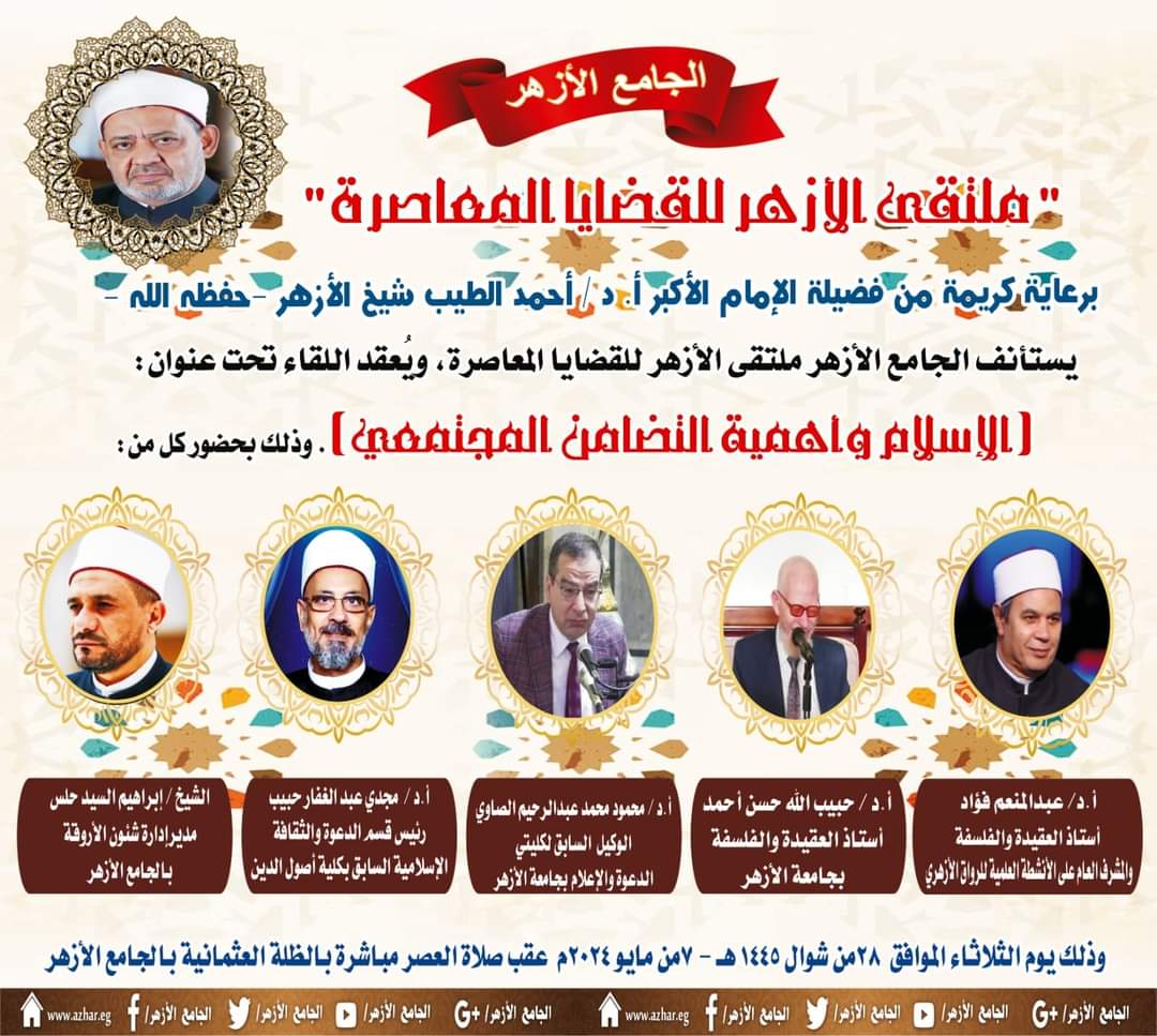 جدير بالذكر أن ملتقى "الأزهر للقضايا المعاصرة" يُعقد الثلاثاء من كل أسبوع في رحاب الجامع الأزهر الشريف، تحت رعاية فضيلة الإمام الأكبر وبتوجيهات من فضيلة الدكتور محمد الضويني وكيل الأزهر الشريف، حيث كان بمسمى "شبهات وردود" وتم تغيير لملتقى الأزهر للقضايا المعاصرة، بعد نجاحه طوال شهر رمضان والذي كان يعقد يوميا عقب صلاة التراويح، ويتناول هذا الملتقى في كل حلقة قضية تهم المجتمع والوطن، والعالَمَين العربي والإسلامي.