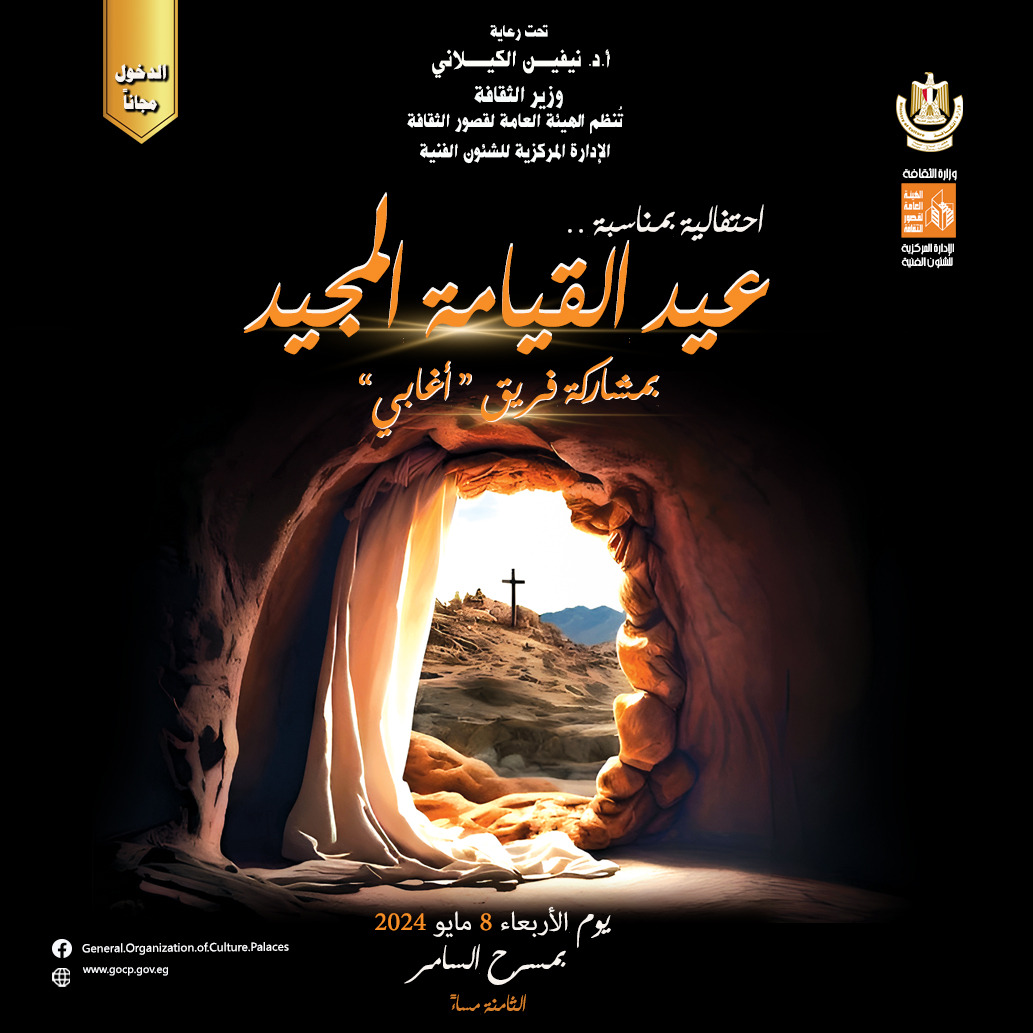 وتعد الاحتفالية التعاون الثاني مع فريق كورال "أغابي"، بعد الأولى التي أقيمت بمناسبة عيد الميلاد المجيد في يناير الماضي، وتأتي ضمن أجندة فعاليات حافلة لهيئة قصور الثقافة هذا الأسبوع تضم مجموعة ثرية ومكثفة من الفعاليات الثقافية والفنية احتفالا بعيد القيامة وأعياد الربيع واستمرار احتفالات عيد العمال وعروض الموسم المسرحي وأفلام السينما وملتقيات مشروع أهل مصر وغيرها من الفعاليات التي تلقى إقبالا وتفاعلا كبيرا بالمحافظات.