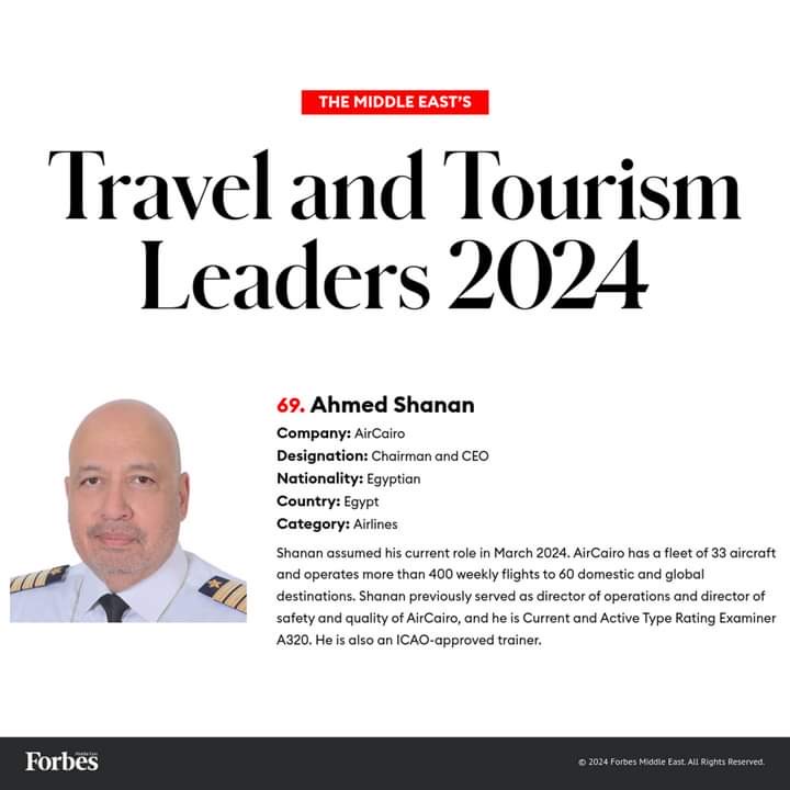 اختارت مجلة FORBES الطيار أحمد شنن الرئيس التنفيذي لشركة إيركايرو التابعة لوزارة الطيران المدني والذراع الاقتصادي للشركة الوطنية مصر للطيران كأحد أفضل 100 شخصية من قادة السياحة والسفر بمنقطة الشرق الأوسط خلال 2024 .