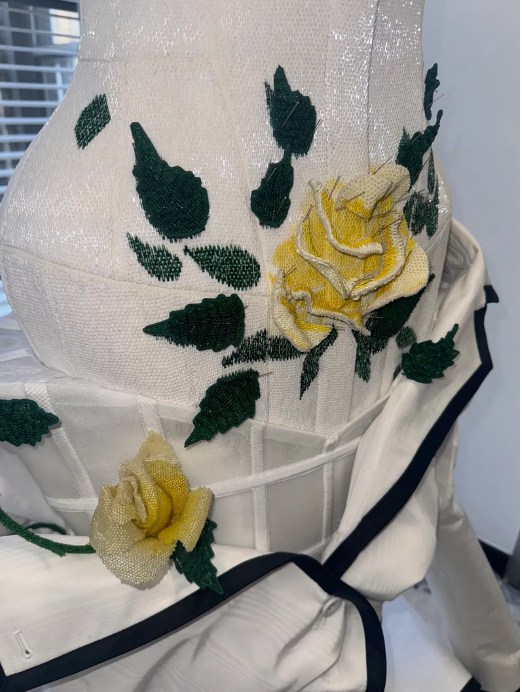 وتألقت البالغة من العمر "28 عامًا" في الحفل مرتديةً فستانًا أوف شولدر باللون الأبيض من توقيع مصمم الأزياء الأميريكي توم براون، وتميز الفستان بالكورسية، الذي استعرض خصرها الرفيع، واعتمد المصمم الشهير على تنورة منفوشة يمكن إزالتها مطرزة بتطريزات أنيقة على شكل ورود صفراء وأوراق شجر خضراء امتدت من منطقة الخصر حتى نهاية الفستان.