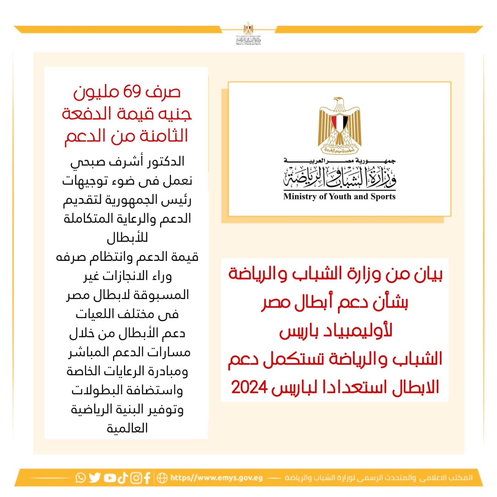 أعلنت وزارة الشباب والرياضة عن استكمال إجمالى قيمة الدعم الخاص بالاستعدادات الخاصة بدورة الألعاب الأولمبية باريس 2024، حيث تم صرف الدفعة الثامنة من الدعم المالى المخصص للاتحادات الرياضية الأوليمبية، وذلك للصرف على برامج الإعداد والتاهيل الفني للمنتخبات والأبطال من معسكرات دولية وقارية وعالمية المؤهلة لدورة الألعاب الأولمبية الصيفية المقبلة باريس 2024.