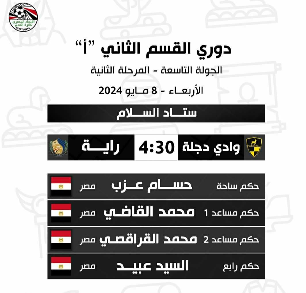يلعب فريق وادي دجلة صاحب المركز الخامس بقيادة الكرواتي توليتش برصيد 45 نقطة مع فريق راية صاحب المركز الثامن بقيادة محمد حليم برصيد 37 نقطة، على ستاد السلام، وذلك في إطار منافسات الجولة التاسعة والأخيرة من المرحلة الثانية "مرحلة الصعود" بدوري المحترفين .