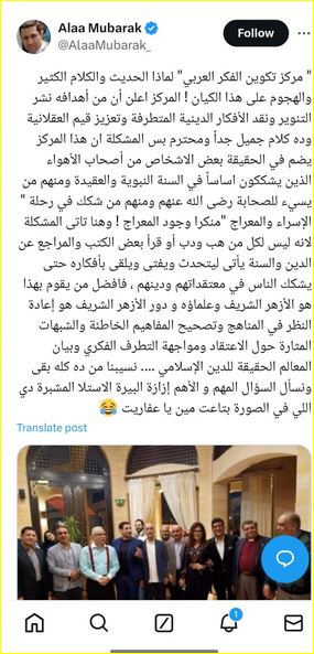نشر علاء مبارك، نجل الرئيس الراحل محمد حسني مبارك، تدوينة عبر موقع التدوينات القصيرة "إكس" تويتر سابقا، علّق فيها على الجدل الدائر بعد الإعلان عن مركز "تكوين للفكر العربي" .
