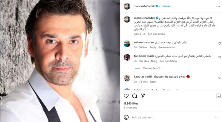 حرصت الفنانة منة فضالي علي نعي النجم كريم عبدالعزيز، في وفاة والدته، معلقة: ربنا يصبر قلبك ويا رب آخر الأحزان.