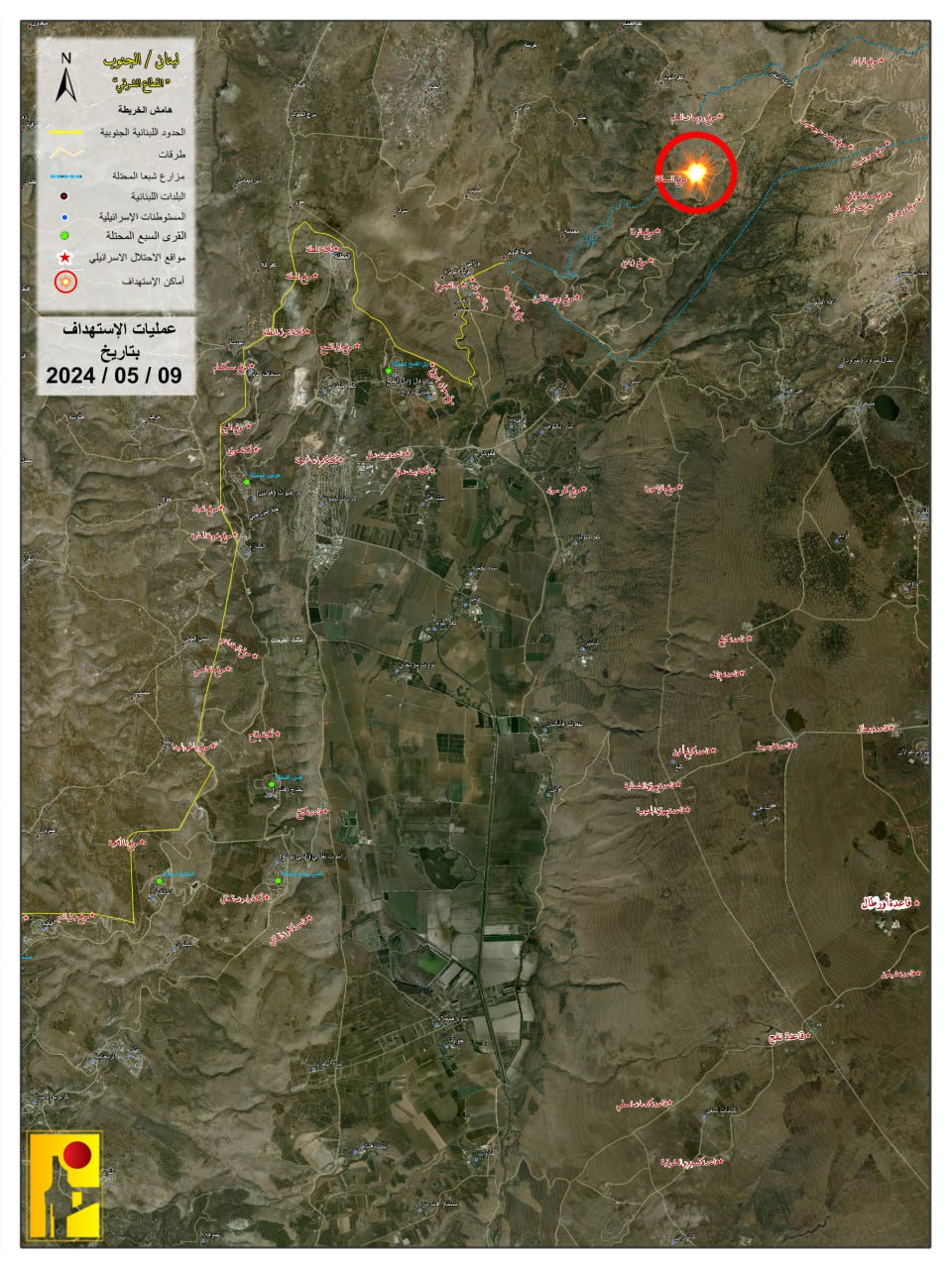 وقال حزب الله في بيان: دعماً لشعبنا الفلسطيني الصامد في قطاع غزة وإسنادًا لمقاومته الباسلة والشريفة، استهدف مجاهدو المقاومة الإسلامية يوم الخميس 09-05-2024 موقع السماقة في تلال كفرشوبا اللبنانية المحتلة بالأسلحة الصاروخية وأصابوه إصابةً مباشرة.