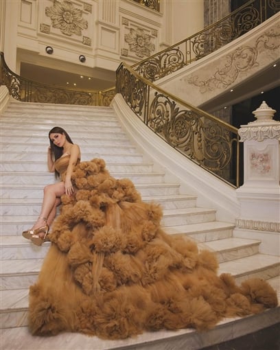 وبدت نسرين طافش بفستان قصير باللون البني الفاتح، وتميز بصيحة الكب، مع اكستنشن متعدد الأطوال ومنفوش، مصنوع من التُل المكشكش، مما أبرز أنوثتها وأناقتها.
