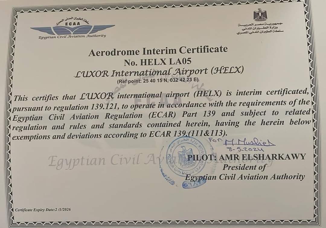 وكان الطيار أحمد منصور رئيس مجلس إدارة الشركة المصرية للمطارات، قد هنأ جميع العاملين بمطار الأقصر الدولي بالحصول على شهادة تجديد الاعتماد من جانب سلطة الطيران المدنى المصرى وذلك بترخيص مطار الأقصر الدولى للعمل كمطار دولى حتى عام ٢٠٢٦، وفقا لمتطلبات المنظمة العالمية للطيران المدنى " إيكاو" الممثلة فى سلطة الطيران المدنى المصري ، طبقا للمواصفات العالمية والمعايير الدولية .