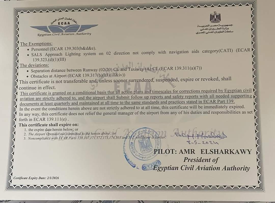 حصل مطار الاقصر الدولي، بقيادة اللواء طيار هشام فريد، على تجديد الترخيص التشغيلي لمدة عامين بعد استيفاء جميع المتطلبات والمعايير الدولية للمنظمة الدولية للطيران المدني ICAO والتشريعات المحلية في مجال تأمين سلامة المطارات.
