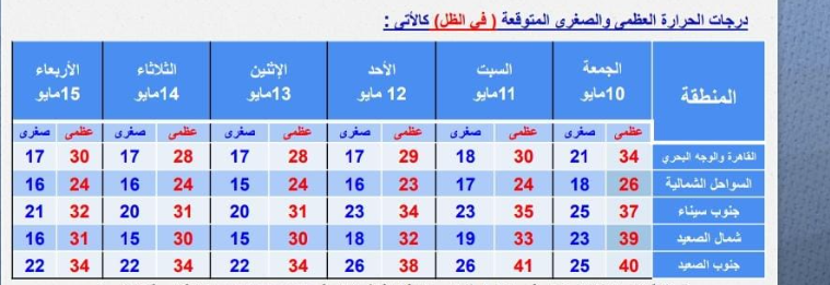 وأوضحت الهيئة أن اليوم الجمعة الموافق 10مايو، يشهد طقس حار نهارًا على القاهرة الكبرى والوجه البحري والسواحل الشمالية الشرقية مائل للحرارة على السواحل الشمالية الغربية، شديد الحرارة على جنوب سيناء وجنوب البلاد معتدل ليلًا على أغلب الأنحاء. ولفتت الهيئة أن اليوم يشهد أيضًا اضطراب في الملاحة البحرية على شواطىء البحر المتوسط وسرعة الرياح (60:50 كم/س) وارتفاع الأمواج (3:2 متر).