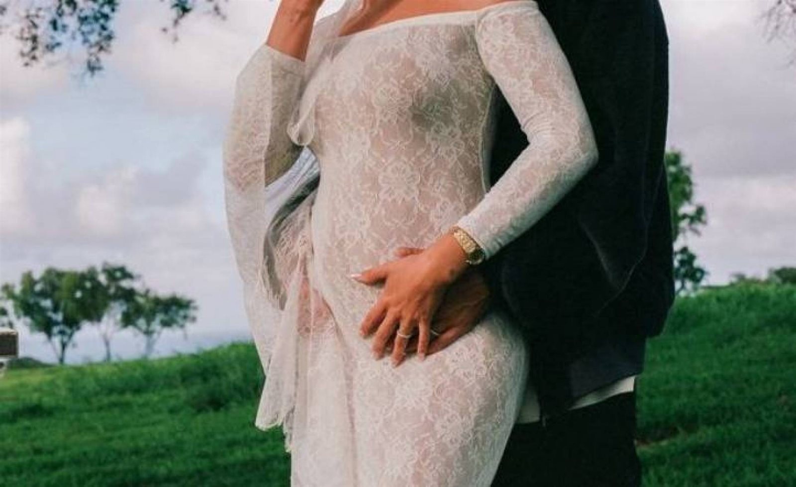 وظهرت عارضة الأزياء بفستان من الدانتيل الأبيض من تصميم أنتوني فاكاريلو، وهو ذو تصميم مجسم أبرز بطنها الذي بدت عليه علامات الحمل.