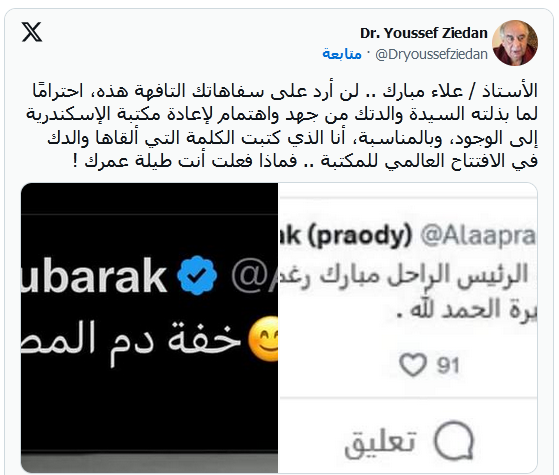 وكتب يوسف زيدان عبر منصة "إكس"، "الاستاذ علاء مبارك.. لن أرد على سفاهاتك التافهة هذه، احترامًا لما بذلته السيدة والدتك من جهد واهتمام لإعادة مكتبة الإسكندرية إلى الوجود، وبالمناسبة، أنا الذي كتبت الكلمة التي ألقاها والدك في الافتتاح العالمي للمكتبة.. فماذا فعلت أنت طيلة عمرك!".