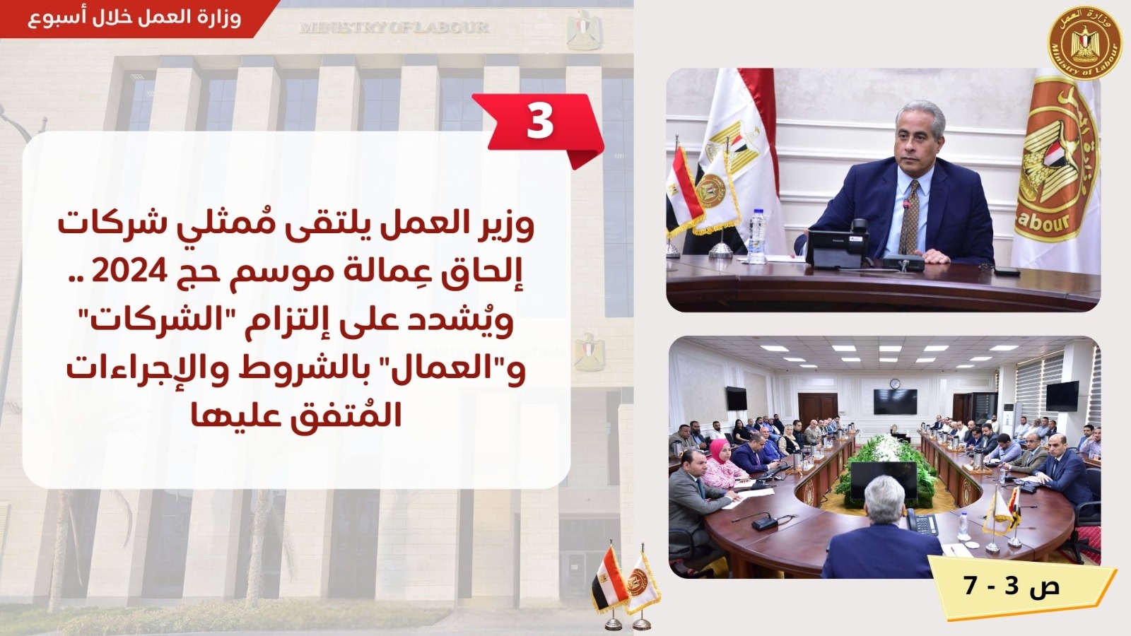 والتقى حسن شحاتة وزير العمل، بديوان عام "الوزارة"، مع عددِ من مُمثلي شركات إلحاق العمالة بالخارج، للوقوف على أخر التطورات بشأن العِمالة المصرية الموسمية لموسم الحج لهذا العام 2024.