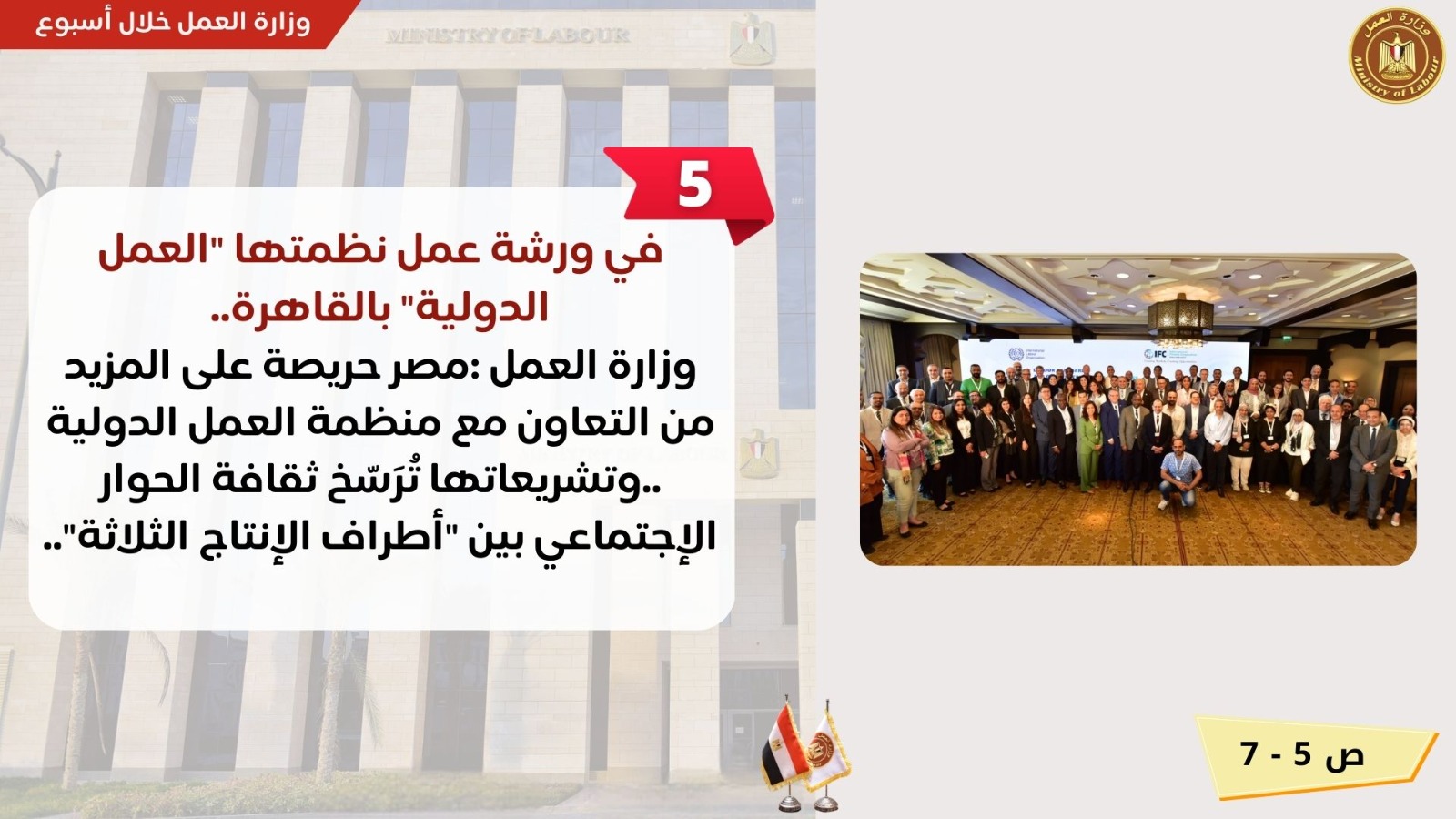 أكدت وزارة العمل، حرصها على المزيد من التعاون مع منظمة العمل الدولية، موضحة أن ثقافة الجمهورية الجديدة تقوم على مبدأ الحوار الاجتماعي بين ثلاثية العمل من حكومة وأصحاب أعمال وعمال، مُثمنة كافة أوجه العمل المُشترك مع منظمة العمل الدولية للمزيد من ترسيخ تلك "الثقافة".