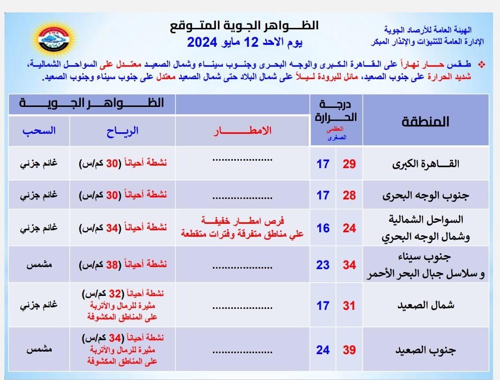 وأكد الأرصاد الجوية، وجود فرص لسقوط أمطار خفيفة على مناطق من السواحل الشمالية وشمال الوجه البحري على فترات متقطعة، فضلًا عن نشاط الرياح على أغلب الأنحاء تكون مثيرة للرمال والأتربة على مناطق من جنوب البلاد.