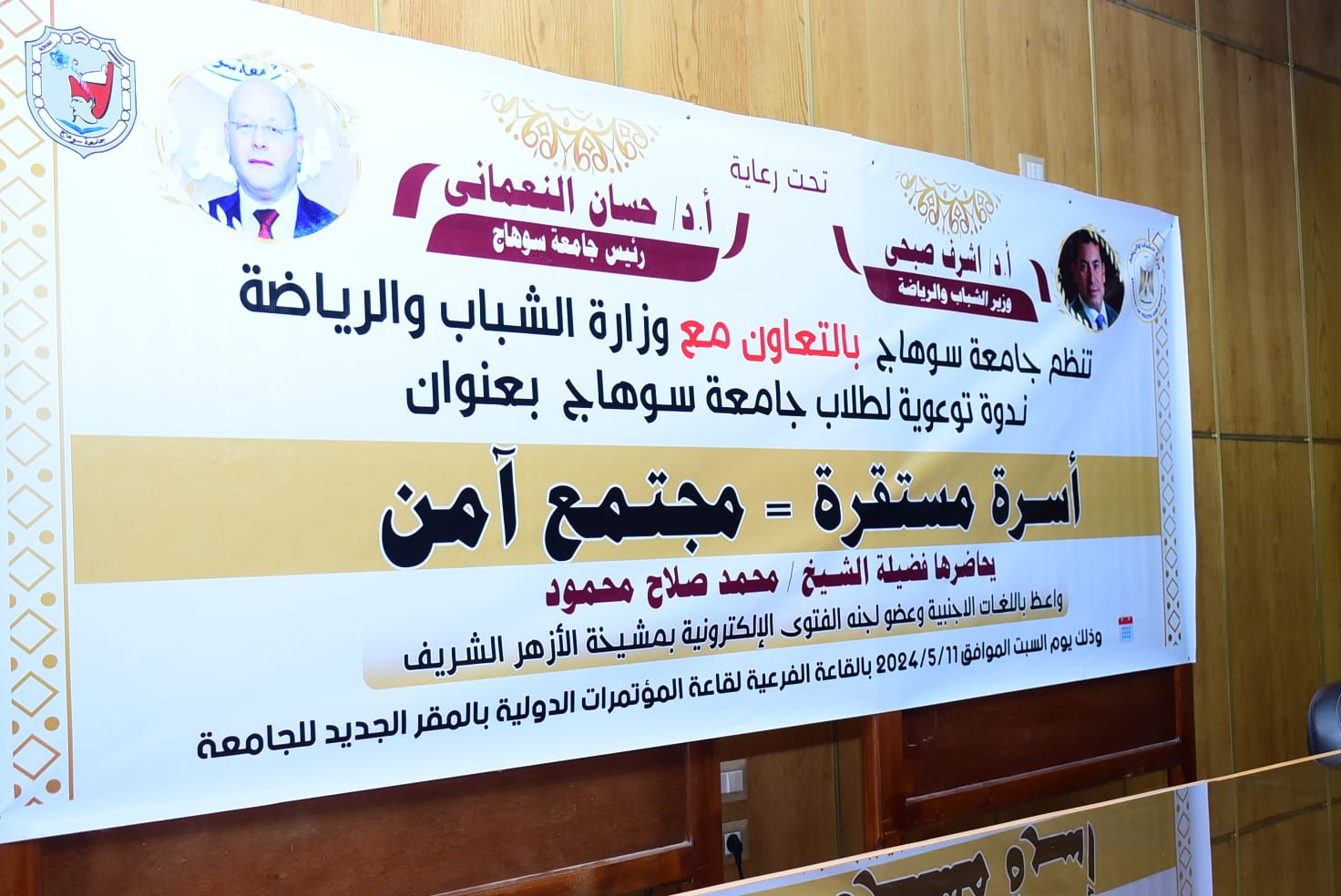 شهد الدكتور أشرف صبحي وزير الشباب والرياضة والدكتور حسان النعماني رئيس جامعة سوهاج، ندوة توعوية مجتمعية للطلاب تحت شعار "أسرة مستقرة = مجتمع آمن"، وذلك ضمن سلسلة الندوات التوعوية بالتعاون مع وزارة الشباب والرياضة، وبحضور كلاً من الدكتور عبد الناصر يس نائب رئيس الجامعة لشئون التعليم والطلاب، الدكتور خالد عمران نائب رئيس الجامعة لشئون خدمة المجتمع وتنمية البيئة، ولفيف من ممثلي وزارة الشباب والرياضة، وعمداء الكليات، وأعضاء هيئة التدريس والطلاب بالجامعة، وذلك بالقاعة الفرعية لقاعة قناة السويس بالحرم الجامعي الجديد.