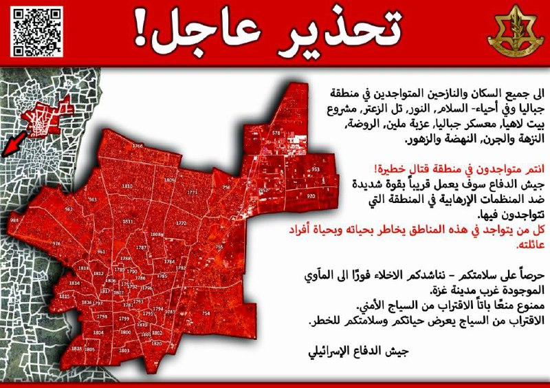 طالب جيش الاحتلال الإسرائيلي، أهالى وسكان منطقة جباليا والأحياء في محيطها، بالاخلاء والتوجه بشكل مؤقت إلى المآوي غرب مدينة غزة، وهذه الخطوة لابعاد السكان عن منطقة القتال بناء على القانون الدولي.