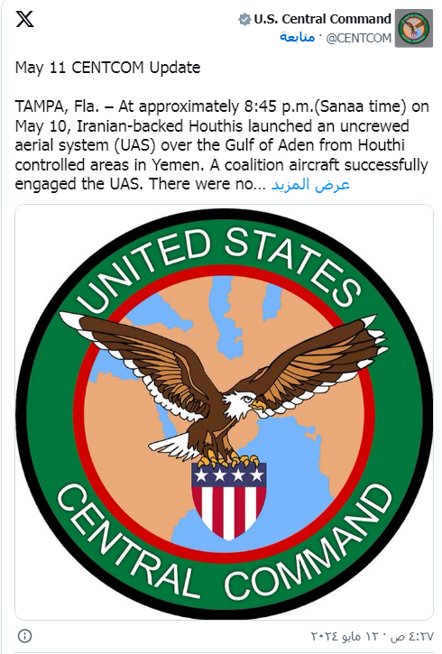 وقالت "سنتاكوم" في بيان لها: "في حوالي الساعة 8:45 مساء يوم 10 مايو، أطلق الحوثيون طائرة مسيرة فوق خليج عدن من مناطق سيطرتهم في اليمن. نجحت طائرة تابعة للتحالف في الاشتباك مع الطائرات بدون طيار. ولم يتم الإبلاغ عن وقوع إصابات أو أضرار من قبل السفن الأميركية أو التحالف أو السفن التجارية".