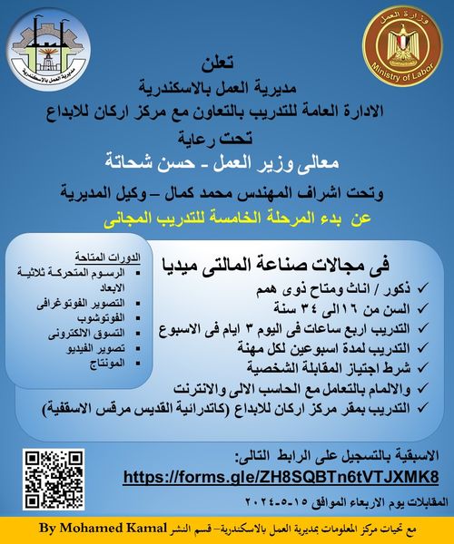 أعلنت مديرية العمل بمحافظة الإسكندرية، عن بدء تلقي طلبات الترشيح للتدريب على "تنمية القدرات الإلكترونية" بالتعاون مع مركز أركان للإبداع، بهدف إعداد الشباب وإصقالهم بالمهارات اللازمة للالتحاق بالعمل في مجالات شبكات التسويق الإلكتروني، وصناعة Multimedia، من أجل تعزيز ثقافة العمل الحر وريادة الاعمال، فضلًا عن إكسابهم مهارات متطورة يحتاجها سوق العمل من خلال حثهم على الابتكار والإبداع، ويشمل البرنامج التدريبي التدريب على الدورات التالية: الرسوم المتحركة ثلاثية الأبعاد، والمونتاج، الفوتوشوب، والتصوير الفوتوغرافي، وتصوير الفيديو، والتسويق الإلكتروني، ويكون التدريب للشباب من الجنسين، لمن هم في سن 16 وحتى 34 سنة، بشرط الإلمام بأساسيات الحاسب الآلي، والإنترنت، واجتياز المقابلة الشخصية، ومدة التدريب أسبوعين كاملين، بمعدل 12 ساعة تدريبية على مدار 3 أيام فى الأسبوع، تحت إشراف الإدارة المركزية للتدريب المهنى بوزارة العمل، ضمن رؤية الوزارة في أهمية التعاون مع مؤسسات المجتمع المدني لدورها المهم في خدمة المجتمع ونشر ثقافة العمل الحر وريادة الأعمال من أجل النهوض بالدولة المصرية.
